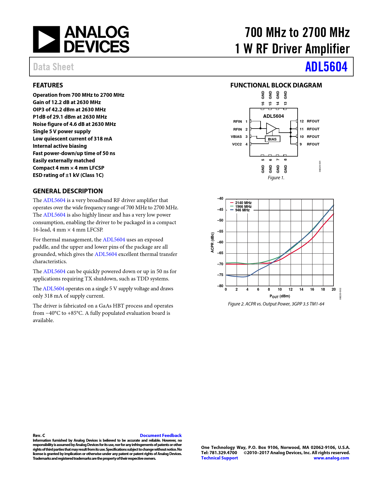 700 MHz to 2700 MHz. 1 W RF Driver Amplifier. Data Sheet. ADL5604. FEATURES. FUNCTIONAL BLOCK DIAGRAM