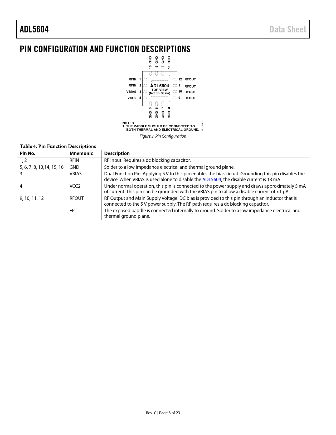 Pages / Page23 / 8 — ADL5604. Data Sheet. PIN CONFIGURATION AND FUNCTION DESCRIPTIONS. RFIN 1. …