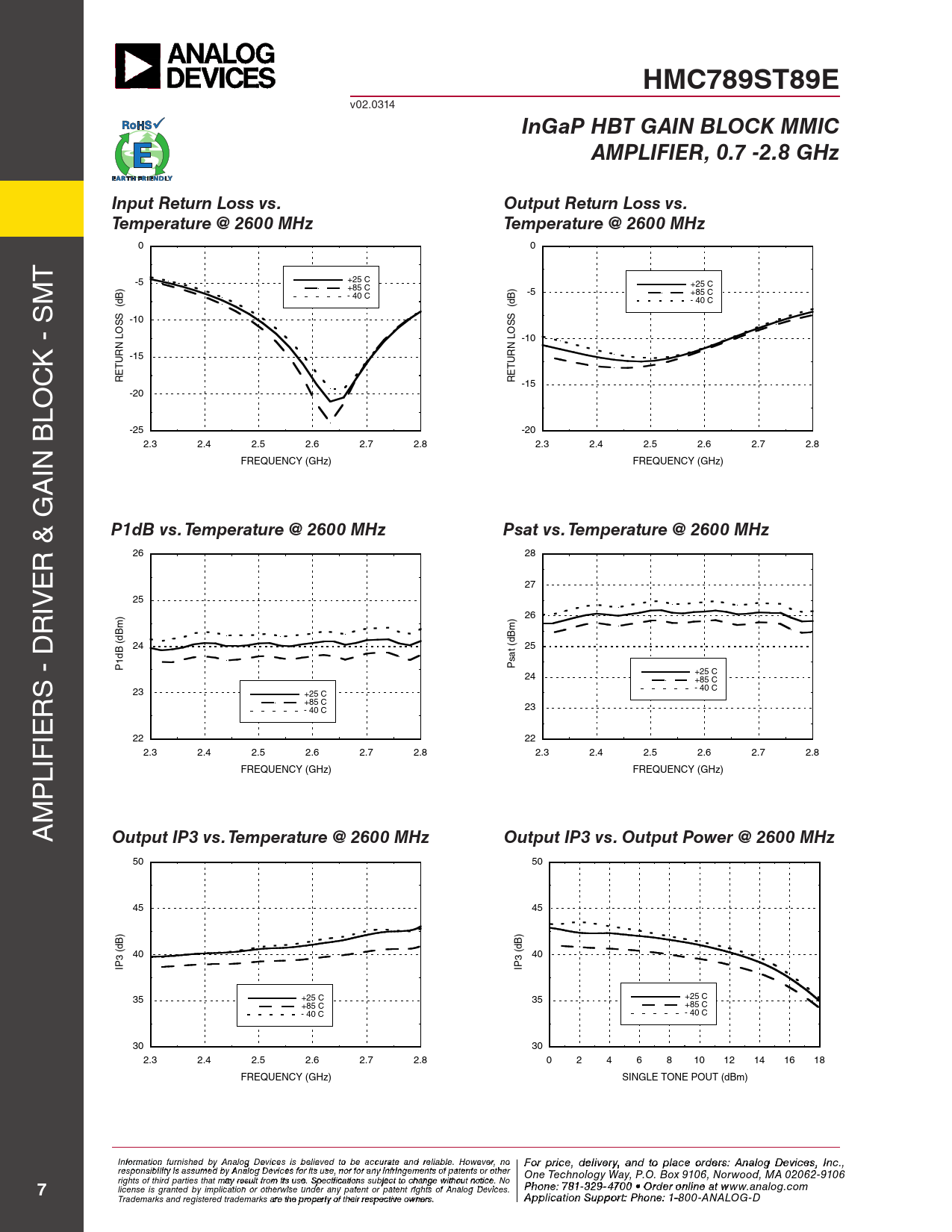 HMC789ST89E v02.0314 InGaP HBT GAIN BLOCK MMICAMPLIFIER, 0.7 -2.8 GHzInput Return Loss vs.Output Return Loss vs.Temperature @ 2600 MHzTemperature @ 2600 MHz 0 0 T M -5 +25 C ) +85 C +25 C ) - 40 C -5 +85 C - 40 C (dB (dB S -10 S S S LO LO -10 K - S N N R -15 R U U C T T E E R R -15 -20 LO -25 -20 2.3 2.4 2.5 2.6 2.7 2.8 2.3 2.4 2.5 2.6 2.7 2.8 IN B FREQUENCY (GHz) FREQUENCY (GHz) A P1dB vs. Temperature @ 2600 MHzPsat vs. Temperature @ 2600 MHz R & G 26 28 E 27 IV 25 R 26 (dBm) 24 (dBm) 25 P1dB Psat +25 C S - D 24 +85 C 23 - 40 C R +25 C +85 C - 40 C 23 IE 22 22 2.3 2.4 2.5 2.6 2.7 2.8 2.3 2.4 2.5 2.6 2.7 2.8 LIF FREQUENCY (GHz) FREQUENCY (GHz) P M A Output IP3 vs. Temperature @ 2600 MHzOutput IP3 vs. Output Power @ 2600 MHz 50 50 45 45 (dB) 40 (dB) 40 IP3 IP3 35 +25 C 35 +25 C +85 C +85 C - 40 C - 40 C 30 30 2.3 2.4 2.5 2.6 2.7 2.8 0 2 4 6 8 10 12 14 16 18 FREQUENCY (GHz) SINGLE TONE POUT (dBm) I F nf o or r p mati r o in cfe ur , d nish e e l d iv b e y r A y a nalo n g d t Devi o p ces i la s c bele o ieve rd d t e o rbs e : H acc iutrtatite e M and ic reli rao bl w e. a H v o e C wever o , nrp o For price, delivery, and to place orders: Analog Devices, Inc., responsibility is assumed by Analog Devices for its use, nor for any infringements of patents or other oration, 2 Elizabeth Drive, Chelmsford, MA 01824 One Technology Way, P.O. Box 9106, Norwood, MA 02062-9106 Phone: 978-250-3343 Fax: 978-250-3373 O rights of third parties that may result from its use. Specifications subject to change without notice. No rd Phoe n r O e: 7 n- 81-li 3 n 2 e a 9-4 t w 70 ww 0 • O . rdh e itt r o it nle i . n co e a m 7 license is granted by implication or otherwise under any patent or patent rights of Analog Devices. t www.analog.com Application Support: Phon Trademarks and registered trademarks are the property of their respective owners. e: 978-250-334 A 3 o pplic r a atio pp n S s u @ p h por ittti : Pte ho.c n o e m : 1-800-ANALOG-D