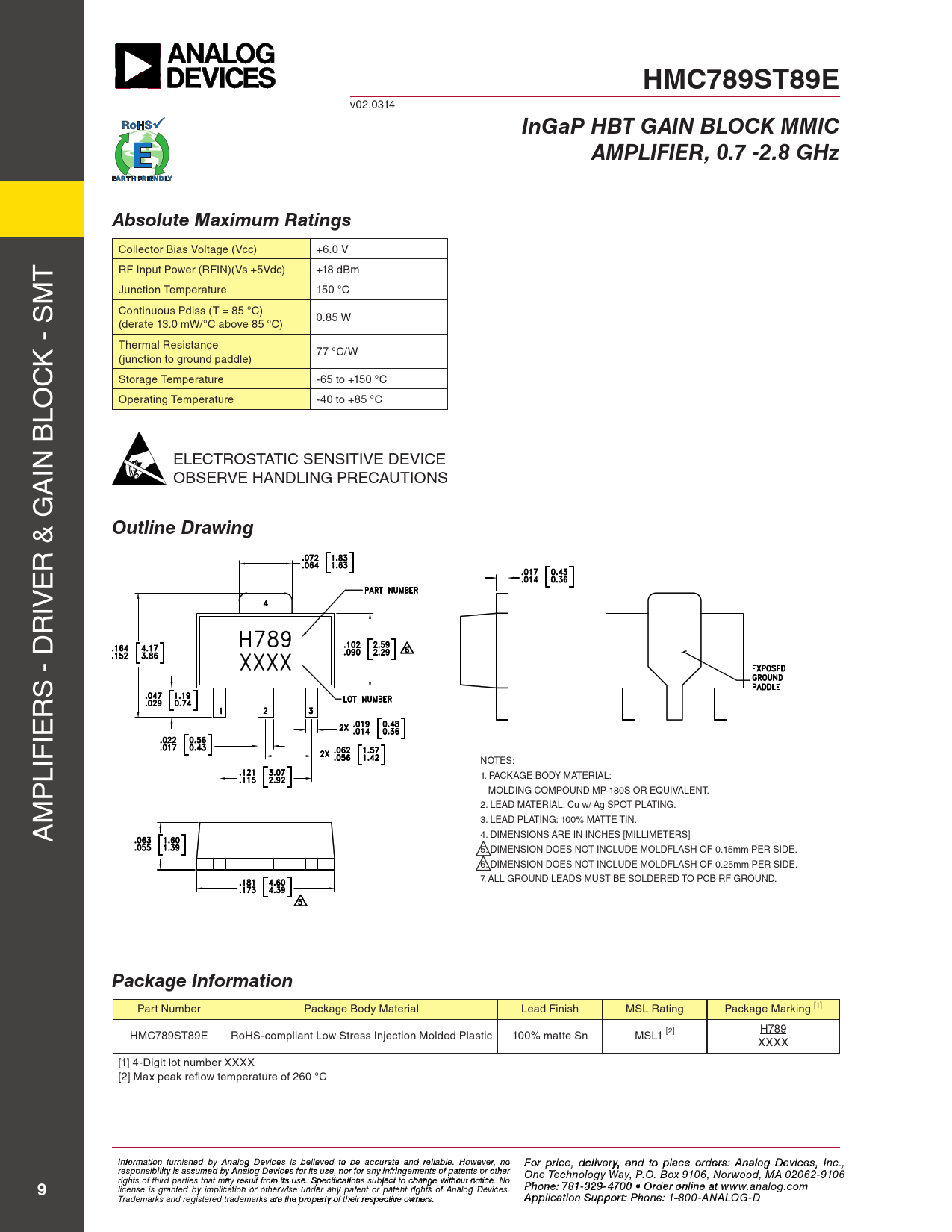 HMC789ST89E. InGaP HBT GAIN BLOCK MMIC. AMPLIFIER, 0.7 -2.8 GHz. Absolute Maximum Ratings. Outline Drawing. Package Information