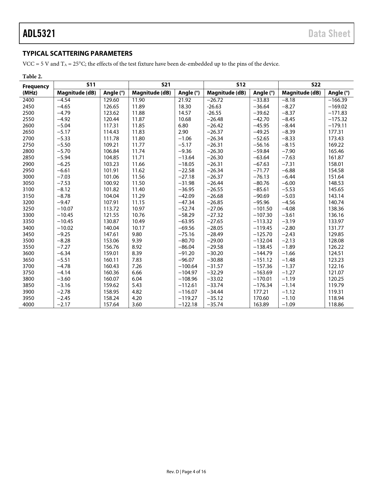 | Pages / Page | 16 / 4 — ADL5321. Data Sheet. TYPICAL SCATTERING PARAMETERS. Table 2. Frequency. … |