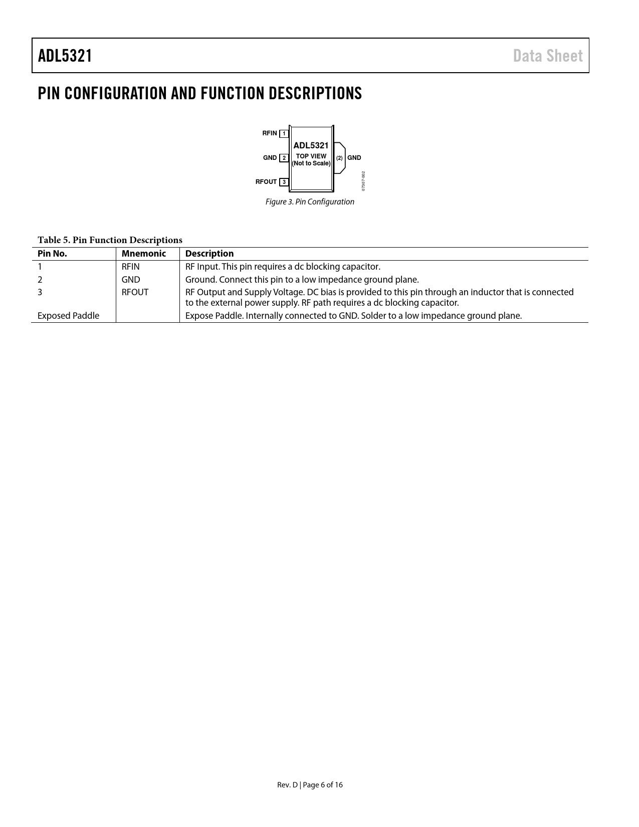 Pages / Page16 / 6 — ADL5321. Data Sheet. PIN CONFIGURATION AND FUNCTION DESCRIPTIONS. RFIN. …