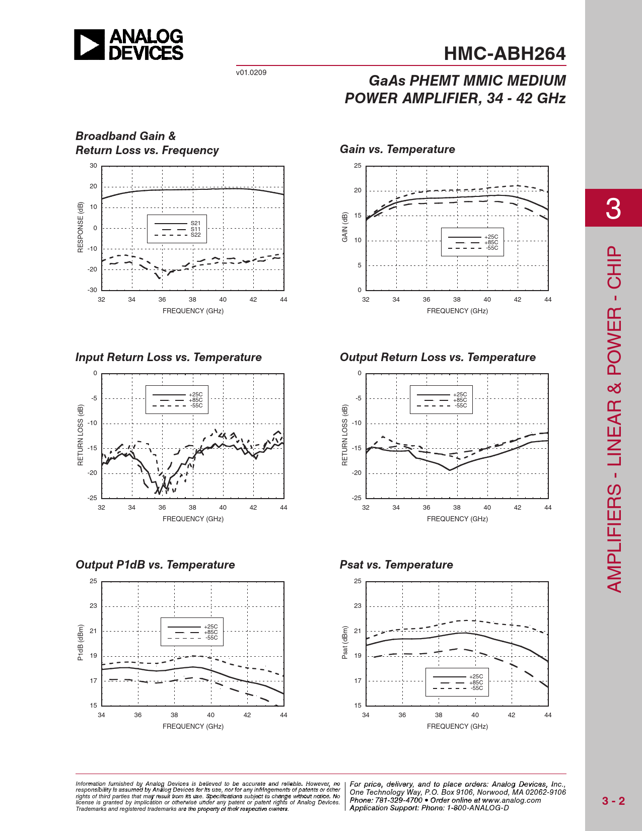 HMC-ABH264 v01.0209 GaAs PHEMT MMIC MEDIUMPOWER AMPLIFIER, 34 - 42 GHzBroadband Gain & Return Loss vs. FrequencyGain vs. Temperature 30 25 20 20 ) 10 (dB ) E 15 S 3 S21 N 0 (dB S11 O IN S22 P A +25C S G 10 E +85C -10 R -55C ip 5 -20 h -30 0 32 34 36 38 40 42 44 32 34 36 38 40 42 44 FREQUENCY (GHz) FREQUENCY (GHz) r - C e w Input Return Loss vs. TemperatureOutput Return Loss vs. Temperature o 0 0 p -5 +25C +25C +85C -5 +85C ) -55C ) -55C r & (dB (dB S -10 S S -10 S A LO LO e N N R -15 R U -15 U T T E E R R lin -20 -20 -25 -25 s - 32 34 36 38 40 42 44 32 34 36 38 40 42 44 r FREQUENCY (GHz) FREQUENCY (GHz) ie lif Output P1dB vs. TemperaturePsat vs. Temperature p 25 25 m A 23 23 +25C 21 +85C 21 -55C (dBm) (dBm) 19 P1dB Psat 19 +25C 17 17 +85C -55C 15 15 34 36 38 40 42 44 34 36 38 40 42 44 FREQUENCY (GHz) FREQUENCY (GHz) Info F rmoatri op n rfiurcne is ,h ed d ebly ivAe n r al y o g aDn evdic eto s i p s bla eli c evee d otro dbe e ras: cc uH ratite tiatne d M reli iac bl reo . w Ho av wev e er , Cno o For price, delivery, and to place orders: Analog Devices, Inc., responsibility is assumed by Analog Devices for its use, nor for any infringements of patents or other rporation, 20 Alpha Road, Chelmsford, MA 01824 One Technology Way, P.O. Box 9106, Norwood, MA 02062-9106 Phone: 978-250-3343 Fax: 978-250-3373 rights of third parties that may result from its use. Specifications subject to change without notice. No O P r h d o e ne r O : 7 n 81- -3li 2n 9 e - 4 a 7 t 0 ww 0 • O w rd .h e it r o tniltie n .c e ao t m license is granted by implication or otherwise under any patent or patent rights of Analog Devices. www.analog.com 3 - 2 Application Support: Pho Trademarks and registered trademarks are the property of their respective owners. ne: 978-250-33 A 4 p 3 p li coarti o ap n S p u s p @ po h rt itt : P ite ho . n c e o : 1m -800-ANALOG-D
