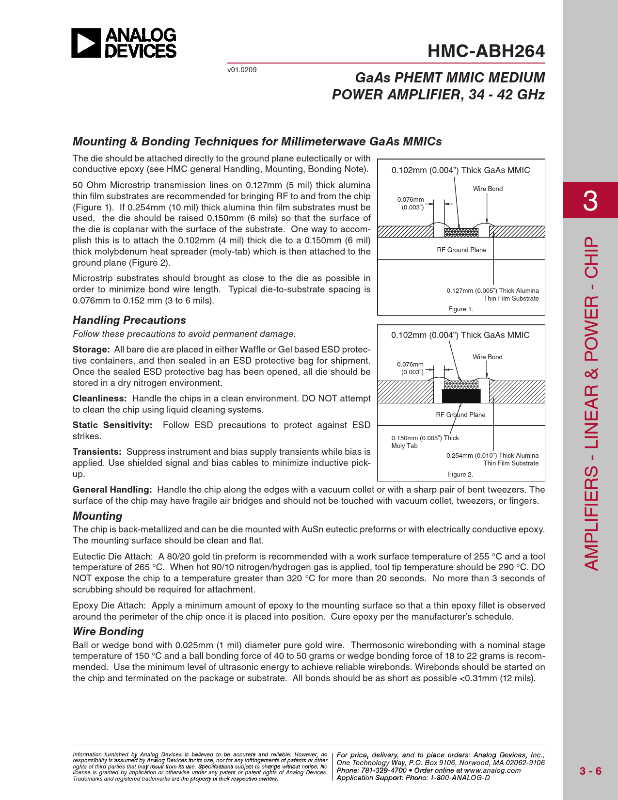 HMC-ABH264 v01.0209 GaAs PHEMT MMIC MEDIUMPOWER AMPLIFIER, 34 - 42 GHzMounting & Bonding Techniques for Millimeterwave GaAs MMICs The die should be attached directly to the ground plane eutectical y or with conductive epoxy (see hmC general handling, mounting, Bonding note). 0.102mm (0.004”) Thick GaAs MMIC 50 ohm microstrip transmission lines on 0.127mm (5 mil) thick alumina Wire Bond thin film substrates are recommended for bringing rf to and from the chip 0.076mm (figure 1). if 0.254mm (10 mil) thick alumina thin film substrates must be (0.003”) 3 used, the die should be raised 0.150mm (6 mils) so that the surface of the die is coplanar with the surface of the substrate. one way to accom- plish this is to attach the 0.102mm (4 mil) thick die to a 0.150mm (6 mil) thick molybdenum heat spreader (moly-tab) which is then attached to the RF Ground Plane ip ground plane (figure 2). h microstrip substrates should brought as close to the die as possible in order to minimize bond wire length. Typical die-to-substrate spacing is 0.127mm (0.005”) Thick Alumina 0.076mm to 0.152 mm (3 to 6 mils). Thin Film Substrate Figure 1. r - C Handling Precautions e Follow these precautions to avoid permanent damage. 0.102mm (0.004”) Thick GaAs MMIC w Storage: All bare die are placed in either waffle or Gel based esD protec- o tive containers, and then sealed in an esD protective bag for shipment. Wire Bond p 0.076mm once the sealed esD protective bag has been opened, all die should be (0.003”) stored in a dry nitrogen environment. Cleanliness: handle the chips in a clean environment. Do noT attempt r & to clean the chip using liquid cleaning systems. A RF Ground Plane e Static Sensitivity: fol ow esD precautions to protect against esD strikes. 0.150mm (0.005”) Thick Moly Tab lin Transients: suppress instrument and bias supply transients while bias is 0.254mm (0.010”) Thick Alumina applied. Use shielded signal and bias cables to minimize inductive pick- Thin Film Substrate up. Figure 2. s - General Handling: handle the chip along the edges with a vacuum col et or with a sharp pair of bent tweezers. The r surface of the chip may have fragile air bridges and should not be touched with vacuum col et, tweezers, or fingers. ie Mounting The chip is back-metal ized and can be die mounted with Ausn eutectic preforms or with electrical y conductive epoxy. lif The mounting surface should be clean and flat. p eutectic Die Attach: A 80/20 gold tin preform is recommended with a work surface temperature of 255 °C and a tool m temperature of 265 °C. when hot 90/10 nitrogen/hydrogen gas is applied, tool tip temperature should be 290 °C. Do A noT expose the chip to a temperature greater than 320 °C for more than 20 seconds. no more than 3 seconds of scrubbing should be required for attachment. epoxy Die Attach: Apply a minimum amount of epoxy to the mounting surface so that a thin epoxy fil et is observed around the perimeter of the chip once it is placed into position. Cure epoxy per the manufacturer’s schedule. Wire Bonding Ball or wedge bond with 0.025mm (1 mil) diameter pure gold wire. Thermosonic wirebonding with a nominal stage temperature of 150 °C and a ball bonding force of 40 to 50 grams or wedge bonding force of 18 to 22 grams is recom- mended. Use the minimum level of ultrasonic energy to achieve reliable wirebonds. wirebonds should be started on the chip and terminated on the package or substrate. All bonds should be as short as possible <0.31mm (12 mils). Info F rmoatri op n rfiurcne is ,h ed d ebly ivAe n r al y o g aDn evdic eto s i p s bla eli c evee d otro dbe e ras: cc uH ratite tiatne d M reli iac bl reo . w Ho av wev e er , Cno o For price, delivery, and to place orders: Analog Devices, Inc., responsibility is assumed by Analog Devices for its use, nor for any infringements of patents or other rporation, 20 Alpha Road, Chelmsford, MA 01824 One Technology Way, P.O. Box 9106, Norwood, MA 02062-9106 Phone: 978-250-3343 Fax: 978-250-3373 rights of third parties that may result from its use. Specifications subject to change without notice. No O P r h d o e ne r O : 7 n 81- -3li 2n 9 e - 4 a 7 t 0 ww 0 • O w rd .h e it r o tniltie n .c e ao t m license is granted by implication or otherwise under any patent or patent rights of Analog Devices. www.analog.com 3 - 6 Application Support: Pho Trademarks and registered trademarks are the property of their respective owners. ne: 978-250-33 A 4 p 3 p li coarti o ap n S p u s p @ po h rt itt : P ite ho . n c e o : 1m -800-ANALOG-D