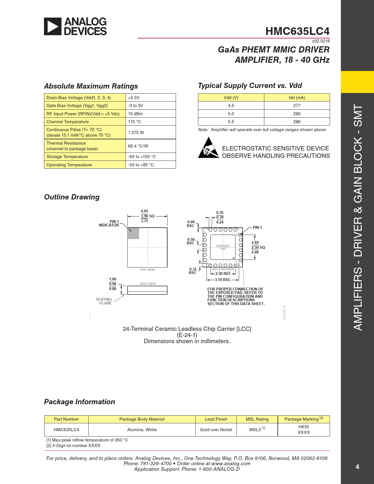HMC635LC4 v02.0218 GaAs PHEMT MMIC DRIVERAMPLIFIER, 18 - 40 GHzAbsolute Maximum RatingsTypical Supply Current vs. Vdd Drain Bias Voltage (Vdd1, 2, 3, 4) +5.5V Vdd (V) Idd (mA) Gate Bias Voltage (Vgg1, Vgg2) -3 to 0V 4.5 277 T RF Input Power (RFIN)(Vdd = +5 Vdc) 15 dBm 5.0 280 M Channel Temperature 175 °C 5.5 286 Continuous Pdiss (T= 70 °C) Note: Amplifier will operate over full voltage ranges shown above 1.575 W (derate 15.1 mW/°C above 70 °C) Thermal Resistance K - S 66.4 °C/W (channel to package base) ELECTROSTATIC SENSITIVE DEVICE C Storage Temperature -65 to +150 °C OBSERVE HANDLING PRECAUTIONS Operating Temperature -55 to +85 °C LO 24-Terminal Ceramic Leadless Chip Carrier [LCC](E-24-1) IN B Dimensions shown in millimeters. A Outline Drawing4.050.363.90 SQ0.30PIN 13.750.080.24INDICATOR R & G BSCPIN 11924181 E 0.502.60 IV BSCEXPOSEDPAD2.50 SQ R 2.40136127TOP VIEW0.32BOTTOM VIEWBSC2.50 REF S - D 1.003.10 BSC R 0.90SIDE VIEW0.80FOR PROPER CONNECTION OFTHE EXPOSED PAD, REFER TO IE THE PIN CONFIGURATION ANDSEATINGFUNCTION DESCRIPTIONSPLANESECTION OF THIS DATA SHEET. LIF P PKG-00484002-27-2017-B M 24-Terminal Ceramic Leadless Chip Carrier [LCC] A (E-24-1) Dimensions shown in mil imeters. Package Information Part Number Package Body Material Lead Finish MSL Rating Package Marking [2] HMC635LC4 Alumina, White Gold over Nickel MSL3 [1] H635 XXXX [1] Max peak reflow temperature of 260 °C [2] 4-Digit lot number XXXX For price, delivery, and to place orders: Analog Devices, Inc., One Technology Way, P.O. Box 9106, Norwood, MA 02062-9106 Phone: 781-329-4700 • Order online at www.analog.com Application Support: Phone: 1-800-ANALOG-D 4 Document Outline Typical Applications Features Functional Diagram General Description Electrical Specifications Reverse Isolation vs. Temperature Gain & Power vs. Supply Voltage @ 30 GHz Noise Figure vs. Temperature Power Compression @ 40 GHz Power Compression @ 30 GHz Psat vs. Temperature P1dB vs. Temperature Output Return Loss vs. Temperature Input Return Loss vs. Temperature Gain vs. Temperature Broadband Gain & Return Loss Output IP3 vs. Temperature Absolute Maximum Ratings Typical Supply Current vs. Vdd Outline Drawing Pin Descriptions Application Circuit Evaluation PCB List of Materials