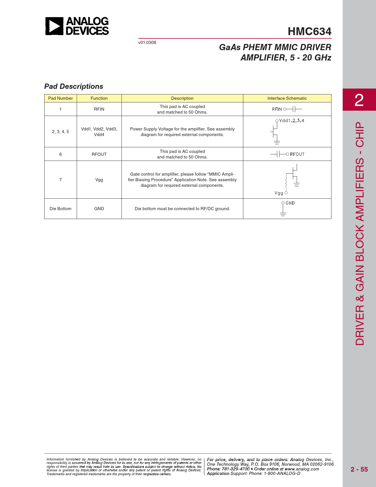 HMC634. GaAs PHEMT MMIC DRIVER. AMPLIFIER, 5 - 20 GHz. Pad Descriptions. 2 - 55