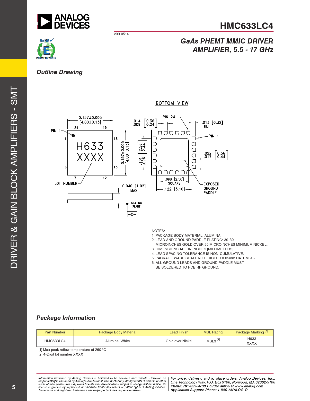 HMC633LC4 v03.0514 GaAs PHEMT MMIC DRIVERAMPLIFIER, 5.5 - 17 GHzOutline Drawing T M S - S R IE LIF P M K A C LO IN B A NOTES: R & G 1. PACKAGE BODY MATERIAL: ALUMINA E 2. LEAD AND GROUND PADDLE PLATING: 30-80 MICROINCHES GOLD OVER 50 MICROINCHES MINIMUM NICKEL. IV 3. DIMENSIONS ARE IN INCHES [MILLIMETERS]. R 4. LEAD SPACING TOLERANCE IS NON-CUMULATIVE. 5. PACKAGE WARP SHALL NOT EXCEED 0.05mm DATUM -C- D 6. ALL GROUND LEADS AND GROUND PADDLE MUST BE SOLDERED TO PCB RF GROUND. Package Information Part Number Package Body Material Lead Finish MSL Rating Package Marking [2] HMC633LC4 Alumina, White Gold over Nickel MSL3 [1] H633 XXXX [1] Max peak reflow temperature of 260 °C [2] 4-Digit lot number XXXX I F nf o or r p mati r o in cfe ur , d nish e e l d iv b e y r A y a nalo n g d t Devi o p ces i la s c bele o ieve rd d t e o rbs e : H acc iutrtatite e M and ic reli rao bl w e. a H v o e C wever o , nrp o For price, delivery, and to place orders: Analog Devices, Inc., responsibility is assumed by Analog Devices for its use, nor for any infringements of patents or other oration, 2 Elizabeth Drive, Chelmsford, MA 01824 One Technology Way, P.O. Box 9106, Norwood, MA 02062-9106 Phone: 978-250-3343 Fax: 978-250-3373 O rights of third parties that may result from its use. Specifications subject to change without notice. No rd Phoe n r O e: 7 n- 81-li 3 n 2 e a 9-4 t w 70 ww 0 • O . rdh e itt r o it nle i . n co e a m 5 license is granted by implication or otherwise under any patent or patent rights of Analog Devices. t www.analog.com Application Support: Phon Trademarks and registered trademarks are the property of their respective owners. e: 978-250-334 A 3 o pplic r a atio pp n S s u @ p h por ittti : Pte ho.c n o e m : 1-800-ANALOG-D
