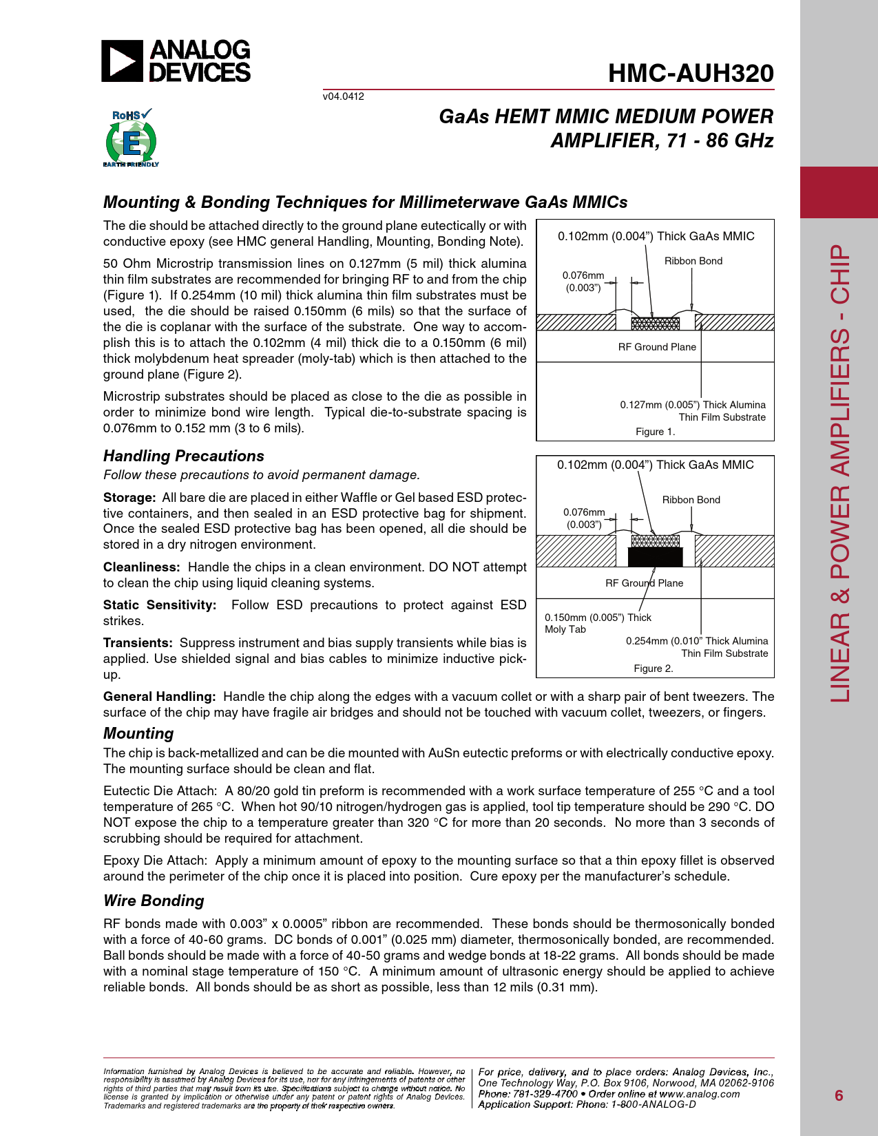 HMC-AUH320 v04.0412 GaAs HEMT MMIC MEDIUM POWERAMPLIFIER, 71 - 86 GHzMounting & Bonding Techniques for Millimeterwave GaAs MMICs The die should be attached directly to the ground plane eutectical y or with conductive epoxy (see HmC general Handling, mounting, Bonding note). 0.102mm (0.004”) Thick GaAs MMIC 50 Ohm Microstrip transmission lines on 0.127mm (5 mil) thick alumina Ribbon Bond iP thin film substrates are recommended for bringing rf to and from the chip 0.076mm (0.003”) H (Figure 1). If 0.254mm (10 mil) thick alumina thin film substrates must be used, the die should be raised 0.150mm (6 mils) so that the surface of the die is coplanar with the surface of the substrate. one way to accom- plish this is to attach the 0.102mm (4 mil) thick die to a 0.150mm (6 mil) RF Ground Plane s - C thick molybdenum heat spreader (moly-tab) which is then attached to the r ground plane (figure 2). ie microstrip substrates should be placed as close to the die as possible in order to minimize bond wire length. Typical die-to-substrate spacing is 0.127mm (0.005”) Thick Alumina Thin Film Substrate Lif 0.076mm to 0.152 mm (3 to 6 mils). Figure 1. P Handling Precautions m 0.102mm (0.004”) Thick GaAs MMIC Follow these precautions to avoid permanent damage. a Storage: all bare die are placed in either waffle or Gel based esD protec- Ribbon Bond r tive containers, and then sealed in an esD protective bag for shipment. 0.076mm e once the sealed esD protective bag has been opened, all die should be (0.003”) stored in a dry nitrogen environment. w o Cleanliness: Handle the chips in a clean environment. Do noT attempt to clean the chip using liquid cleaning systems. RF Ground Plane Static Sensitivity: fol ow esD precautions to protect against esD strikes. 0.150mm (0.005”) Thick Moly Tab r & P Transients: suppress instrument and bias supply transients while bias is 0.254mm (0.010” Thick Alumina a applied. Use shielded signal and bias cables to minimize inductive pick- Thin Film Substrate e up. Figure 2. General Handling: Handle the chip along the edges with a vacuum col et or with a sharp pair of bent tweezers. The Lin surface of the chip may have fragile air bridges and should not be touched with vacuum col et, tweezers, or fingers. Mounting The chip is back-metal ized and can be die mounted with AuSn eutectic preforms or with electrical y conductive epoxy. The mounting surface should be clean and flat. Eutectic Die Attach: A 80/20 gold tin preform is recommended with a work surface temperature of 255 °C and a tool temperature of 265 °C. when hot 90/10 nitrogen/hydrogen gas is applied, tool tip temperature should be 290 °C. Do noT expose the chip to a temperature greater than 320 °C for more than 20 seconds. no more than 3 seconds of scrubbing should be required for attachment. epoxy Die attach: apply a minimum amount of epoxy to the mounting surface so that a thin epoxy fil et is observed around the perimeter of the chip once it is placed into position. Cure epoxy per the manufacturer’s schedule. Wire Bonding rf bonds made with 0.003” x 0.0005” ribbon are recommended. These bonds should be thermosonical y bonded with a force of 40-60 grams. DC bonds of 0.001” (0.025 mm) diameter, thermosonical y bonded, are recommended. Ball bonds should be made with a force of 40-50 grams and wedge bonds at 18-22 grams. all bonds should be made with a nominal stage temperature of 150 °C. a minimum amount of ultrasonic energy should be applied to achieve reliable bonds. all bonds should be as short as possible, less than 12 mils (0.31 mm). Inf F or o m r p atio r n ifc ur e n , d ishe e d lbiv y e A r n y a alog n D d t evic o p es is la beclie o eved rd to ebre sa: H ccur iattti e tae M nd re ilicarbloew . H a o ve C wever, o n rp o For price, delivery, and to place orders: Analog Devices, Inc., responsibility is assumed by Analog Devices for its use, nor for any infringements of patents or other oration, 2 Elizabeth Drive, Chelmsford, MA 01824 One Technology Way, P.O. Box 9106, Norwood, MA 02062-9106 Phone: 978-250-3343 Fax: 978-250-3373 O rights of third parties that may result from its use. Specifications subject to change without notice. No P rd ho e ne r O : 7 n 81- -3li 2n 9 e a -47 t w 0 w 0 • O w rd .h e it r o tniltie n .c e ao t m license is granted by implication or otherwise under any patent or patent rights of Analog Devices. www.analog.com 6 Application Support: Pho Trademarks and registered trademarks are the property of their respective owners. ne: 978-250-33 A 4 p 3 o plica r a tio p n S p u s p @ po h rt itt : P ite ho . n c e o : 1m -800-ANALOG-D