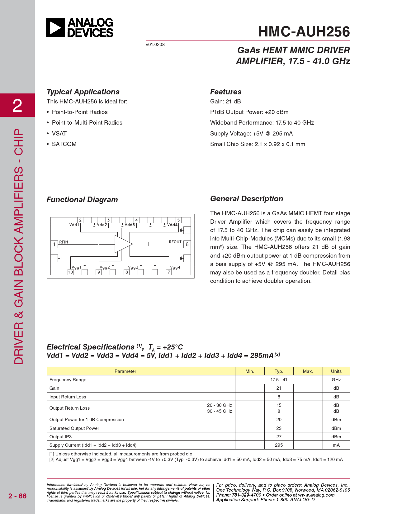 HMC-AUH256 v01.0208 GaAs HEMT MMIC DRIVERAMPLIFIER, 17.5 - 41.0 GHzTypical ApplicationsFeatures 2 This HMC-AUH256 is ideal for: Gain: 21 dB • Point-to-Point Radios P1dB Output Power: +20 dBm • Point-to-Multi-Point Radios Wideband Performance: 17.5 to 40 GHz IP • VSAT Supply Voltage: +5V @ 295 mA H • SATCOM Small Chip Size: 2.1 x 0.92 x 0.1 mm - C S R IE IF Functional DiagramGeneral Description L P The HMC-AUH256 is a GaAs MMIC HEMT four stage M Driver Amplifi er which covers the frequency range of 17.5 to 40 GHz. The chip can easily be integrated K A into Multi-Chip-Modules (MCMs) due to its small (1.93 mm2) size. The HMC-AUH256 offers 21 dB of gain OC and +20 dBm output power at 1 dB compression from a bias supply of +5V @ 295 mA. The HMC-AUH256 BL may also be used as a frequency doubler. Detail bias condition to achieve doubler operation. IN A & G R E IV Electrical Specifi cations [1], T = +25°C R AVdd1 = Vdd2 = Vdd3 = Vdd4 = 5V, Idd1 + Idd2 + Idd3 + Idd4 = 295mA [2] D Parameter Min. Typ. Max. Units Frequency Range 17.5 - 41 GHz Gain 21 dB Input Return Loss 8 dB 20 - 30 GHz 15 dB Output Return Loss 30 - 45 GHz 8 dB Output Power for 1 dB Compression 20 dBm Saturated Output Power 23 dBm Output IP3 27 dBm Supply Current (Idd1 + Idd2 + Idd3 + Idd4) 295 mA [1] Unless otherwise indicated, all measurements are from probed die [2] Adjust Vgg1 = Vgg2 = Vgg3 = Vgg4 between -1V to +0.3V (Typ. -0.3V) to achieve Idd1 = 50 mA, Idd2 = 50 mA, Idd3 = 75 mA, Idd4 = 120 mA Information furnish F ed obr pri y Anal ce, de og Device li s vie s r beyli, a eve nd to pla d to be accura ce o te and rder reliabl s e , pl . Ho ease co wever, no For price, delivery, and to place orders: Analog Devices, Inc., responsibility is assumed by Analog Devices for its use, nor for any infringements of patents or other ntact Hittite Microwave Corporation: One Technology Way, P.O. Box 9106, Norwood, MA 02062-9106 rights of third parties that may result from its use. Specifications subject to change without notice. No 2 - 66 20 Alpha Road, Chelmsford, MA 01824 Phone: 978 Phon - e 25 : 7 0 81--3 32 3 9 4 - 3 F 70 ax 0 • O : 978 rder on -li25 n 0 e a - t 33 ww 73 license is granted by implication or otherwise under any patent or patent rights of Analog Devices. w.analog.com Order On Trademarks and registered trademarks are the property of their respective owners. -line at www.h A it p tpite.co licatio m n Support: Phone: 1-800-ANALOG-D