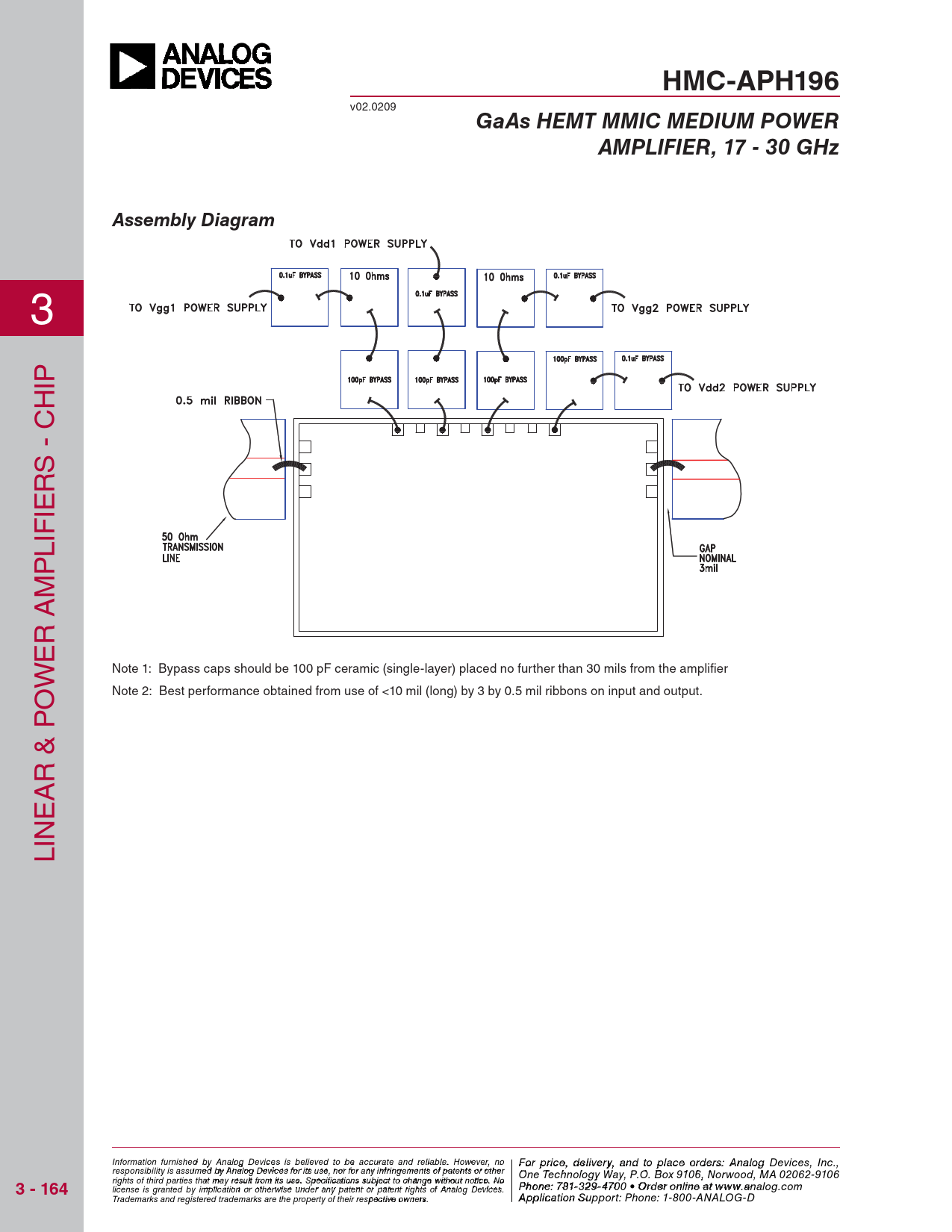 HMC-APH196 v02.0209 GaAs HEMT MMIC MEDIUM POWERAMPLIFIER, 17 - 30 GHzAssembly Diagram 3 IP H S - C R IE IF L P M R A E W Note 1: Bypass caps should be 100 pF ceramic (single-layer) placed no further than 30 mils from the amplifi er O Note 2: Best performance obtained from use of <10 mil (long) by 3 by 0.5 mil ribbons on input and output. R & P A E IN L Information furnish F ed obr pri y Anal ce, de og Device li s vie s r beyli, a eve nd to pla d to be accura ce o te and rder reliabl s e , pl . Ho ease co wever, no For price, delivery, and to place orders: Analog Devices, Inc., responsibility is assumed by Analog Devices for its use, nor for any infringements of patents or other ntact Hittite Microwave Corporation: One Technology Way, P.O. Box 9106, Norwood, MA 02062-9106 rights of third parties that may result from its use. Specifications subject to change without notice. No 3 - 164 20 Alpha Road, Chelmsford, MA 01824 Phone: 978 Phon - e 25 : 7 0 81--3 32 3 9 4 - 3 F 70 ax 0 • O : 978 rder on -li25 n 0 e a - t 33 ww 73 license is granted by implication or otherwise under any patent or patent rights of Analog Devices. w.analog.com Order On Trademarks and registered trademarks are the property of their respective owners. -line at www.h A it p tpite.co licatio m n Support: Phone: 1-800-ANALOG-D
