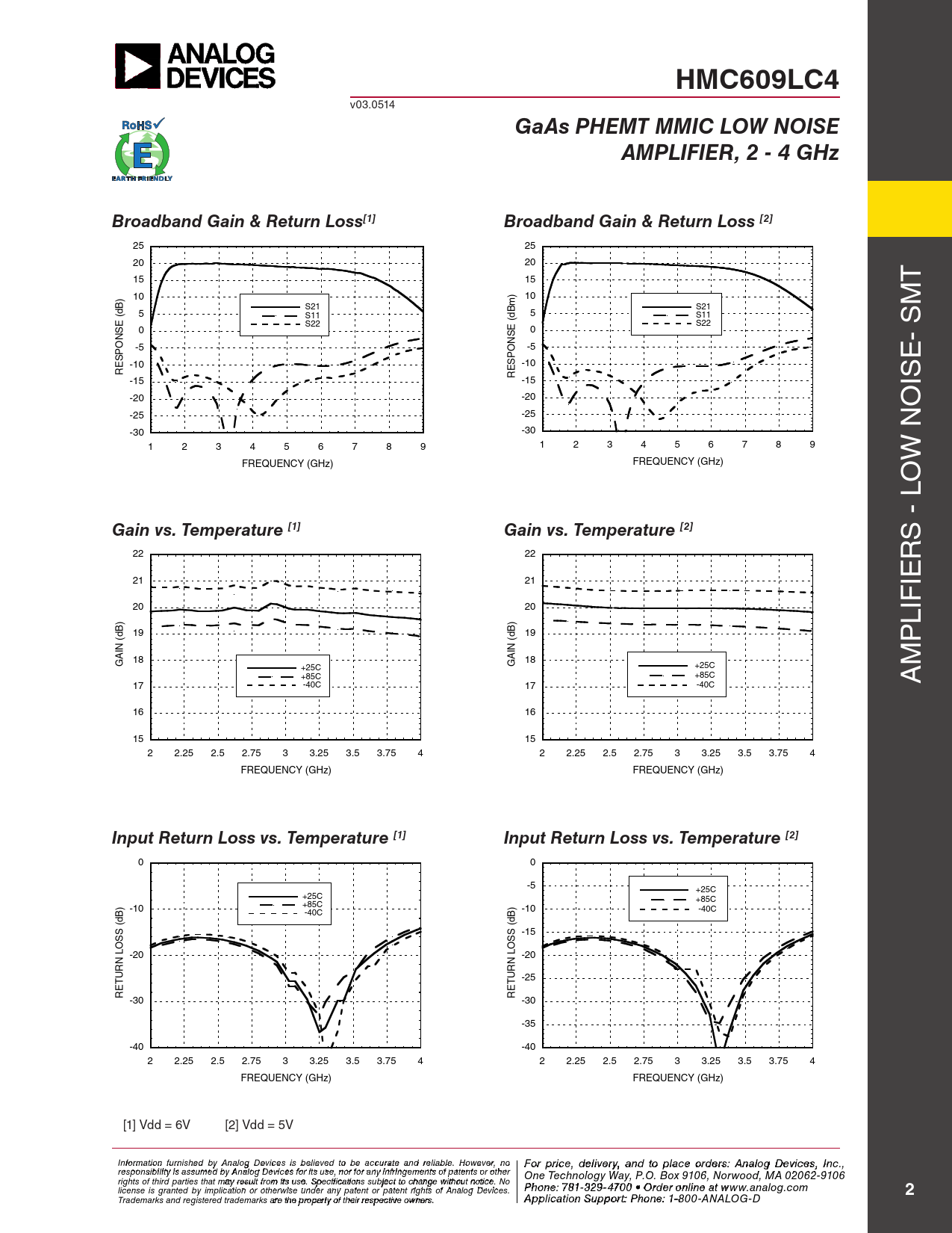 HMC609LC4 v03.0514 GaAs PHEMT MMIC LOW NOISEAMPLIFIER, 2 - 4 GHzBroadband Gain & Return Loss[1]Broadband Gain & Return Loss [2] 25 25 20 20 15 15 T 10 10 S21 S21 M (dB) 5 S11 5 S11 (dBm) S22 S22 0 0 - S -5 -5 E -10 -10 RESPONSE RESPONSE -15 -15 IS -20 -20 O -25 -25 -30 -30 1 2 3 4 5 6 7 8 9 1 2 3 4 5 6 7 8 9 FREQUENCY (GHz) W N FREQUENCY (GHz) O Gain vs. Temperature [1]Gain vs. Temperature [2] S - L 22 22 R 21 21 IE 20 20 LIF 19 19 (dB) (dB) P 18 GAIN 18 +25C GAIN +25C M +85C +85C 17 -40C 17 -40C A 16 16 15 15 2 2.25 2.5 2.75 3 3.25 3.5 3.75 4 2 2.25 2.5 2.75 3 3.25 3.5 3.75 4 FREQUENCY (GHz) FREQUENCY (GHz) Input Return Loss vs. Temperature [1]Input Return Loss vs. Temperature [2] 0 0 -5 +25C +25C +85C -10 +85C -40C -10 -40C (dB) (dB) -15 LOSS -20 LOSS -20 -25 RETURN RETURN -30 -30 -35 -40 -40 2 2.25 2.5 2.75 3 3.25 3.5 3.75 4 2 2.25 2.5 2.75 3 3.25 3.5 3.75 4 FREQUENCY (GHz) FREQUENCY (GHz) [1] Vdd = 6V [2] Vdd = 5V I F nf o or r p mati r o in cfe ur , d nish e e l d iv b e y r A y a nalo n g d t Devi o p ces i la s c bele o ieve rd d t e o rbs e : H acc iutrtatite e M and ic reli rao bl w e. a H v o e C wever o , nrp o For price, delivery, and to place orders: Analog Devices, Inc., responsibility is assumed by Analog Devices for its use, nor for any infringements of patents or other oration, 2 Elizabeth Drive, Chelmsford, MA 01824 One Technology Way, P.O. Box 9106, Norwood, MA 02062-9106 Phone: 978-250-3343 Fax: 978-250-3373 O rights of third parties that may result from its use. Specifications subject to change without notice. No rd Phoe n r O e: 7 n- 81-li 3 n 2 e a 9-4 t w 70 ww 0 • O . rdh e itt r o it nle i . n co e a m license is granted by implication or otherwise under any patent or patent rights of Analog Devices. t www.analog.com 2 Application Support: Phon Trademarks and registered trademarks are the property of their respective owners. e: 978-250-334 A 3 o pplic r a atio pp n S s u @ p h por ittti : Pte ho.c n o e m : 1-800-ANALOG-D