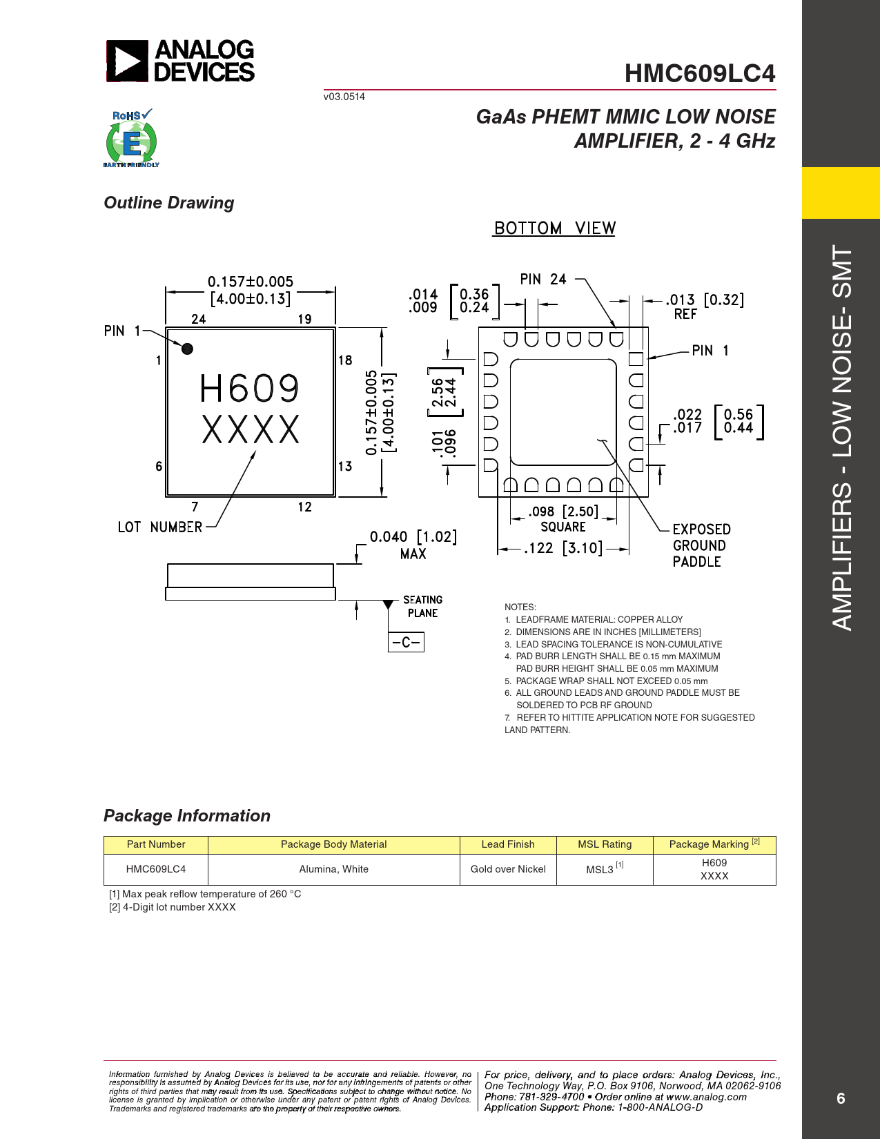 HMC609LC4 v03.0514 GaAs PHEMT MMIC LOW NOISEAMPLIFIER, 2 - 4 GHzOutline Drawing T M - S E IS O W N O S - L R IE LIF P NOTES: M 1. LEADFRAME MATERIAL: COPPER ALLOY 2. DIMENSIONS ARE IN INCHES [MILLIMETERS] A 3. LEAD SPACING TOLERANCE IS NON-CUMULATIVE 4. PAD BURR LENGTH SHALL BE 0.15 mm MAXIMUM PAD BURR HEIGHT SHALL BE 0.05 mm MAXIMUM 5. PACKAGE WRAP SHALL NOT EXCEED 0.05 mm 6. ALL GROUND LEADS AND GROUND PADDLE MUST BE SOLDERED TO PCB RF GROUND 7. REFER TO HITTITE APPLICATION NOTE FOR SUGGESTED LAND PATTERN. Package Information Part Number Package Body Material Lead Finish MSL Rating Package Marking [2] HMC609LC4 Alumina, White Gold over Nickel MSL3 [1] H609 XXXX [1] Max peak reflow temperature of 260 °C [2] 4-Digit lot number XXXX I F nf o or r p mati r o in cfe ur , d nish e e l d iv b e y r A y a nalo n g d t Devi o p ces i la s c bele o ieve rd d t e o rbs e : H acc iutrtatite e M and ic reli rao bl w e. a H v o e C wever o , nrp o For price, delivery, and to place orders: Analog Devices, Inc., responsibility is assumed by Analog Devices for its use, nor for any infringements of patents or other oration, 2 Elizabeth Drive, Chelmsford, MA 01824 One Technology Way, P.O. Box 9106, Norwood, MA 02062-9106 Phone: 978-250-3343 Fax: 978-250-3373 O rights of third parties that may result from its use. Specifications subject to change without notice. No rd Phoe n r O e: 7 n- 81-li 3 n 2 e a 9-4 t w 70 ww 0 • O . rdh e itt r o it nle i . n co e a m license is granted by implication or otherwise under any patent or patent rights of Analog Devices. t www.analog.com 6 Application Support: Phon Trademarks and registered trademarks are the property of their respective owners. e: 978-250-334 A 3 o pplic r a atio pp n S s u @ p h por ittti : Pte ho.c n o e m : 1-800-ANALOG-D