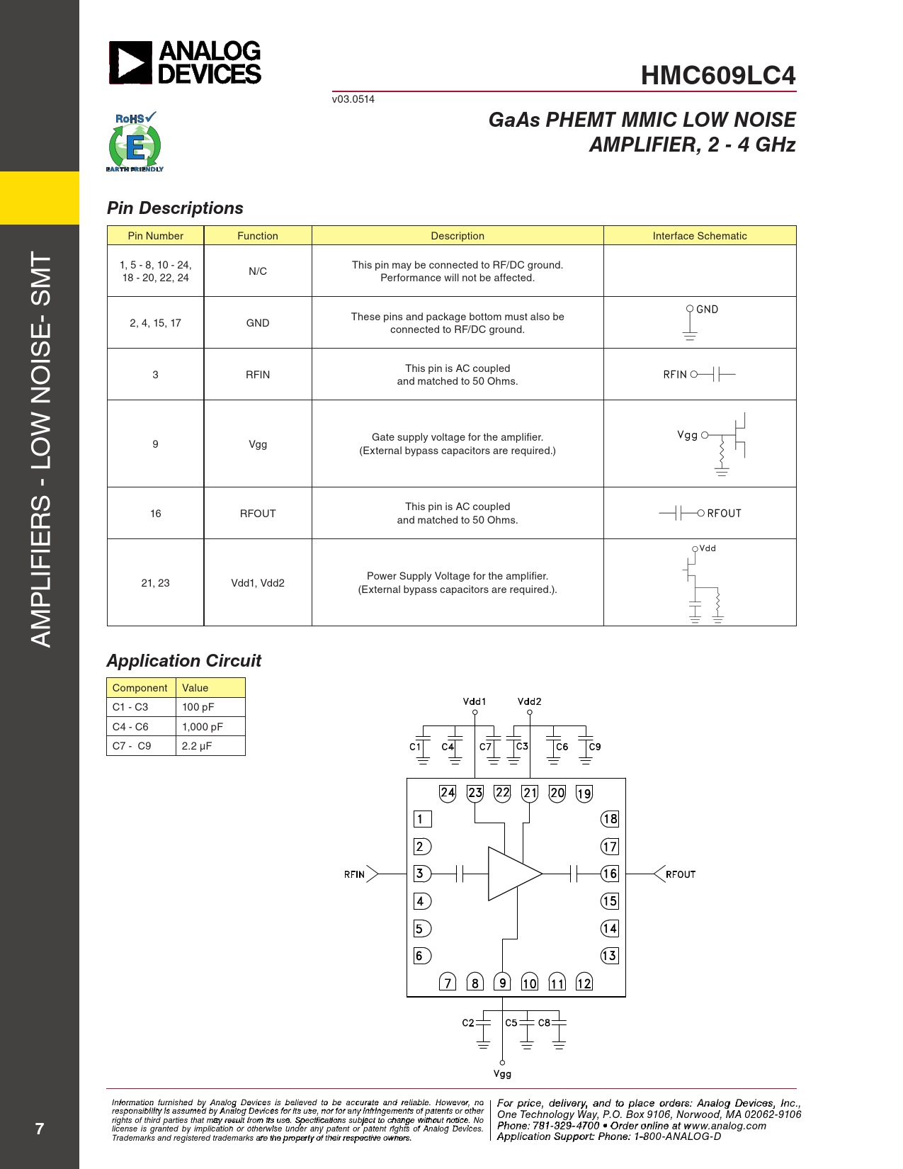 HMC609LC4 v03.0514 GaAs PHEMT MMIC LOW NOISEAMPLIFIER, 2 - 4 GHzPin Descriptions Pin Number Function Description Interface Schematic T M 1, 5 - 8, 10 - 24, This pin may be connected to RF/DC ground. N/C 18 - 20, 22, 24 Performance will not be affected. - S E These pins and package bottom must also be 2, 4, 15, 17 GND connected to RF/DC ground. IS O This pin is AC coupled 3 RFIN and matched to 50 Ohms. W N O Gate supply voltage for the amplifier. 9 Vgg (External bypass capacitors are required.) S - L R This pin is AC coupled 16 RFOUT and matched to 50 Ohms. IE LIF Power Supply Voltage for the amplifier. 21, 23 Vdd1, Vdd2 P (External bypass capacitors are required.). M A Application Circuit Component Value C1 - C3 100 pF C4 - C6 1,000 pF C7 - C9 2.2 µF I F nf o or r p mati r o in cfe ur , d nish e e l d iv b e y r A y a nalo n g d t Devi o p ces i la s c bele o ieve rd d t e o rbs e : H acc iutrtatite e M and ic reli rao bl w e. a H v o e C wever o , nrp o For price, delivery, and to place orders: Analog Devices, Inc., responsibility is assumed by Analog Devices for its use, nor for any infringements of patents or other oration, 2 Elizabeth Drive, Chelmsford, MA 01824 One Technology Way, P.O. Box 9106, Norwood, MA 02062-9106 Phone: 978-250-3343 Fax: 978-250-3373 O rights of third parties that may result from its use. Specifications subject to change without notice. No rd Phoe n r O e: 7 n- 81-li 3 n 2 e a 9-4 t w 70 ww 0 • O . rdh e itt r o it nle i . n co e a m 7 license is granted by implication or otherwise under any patent or patent rights of Analog Devices. t www.analog.com Application Support: Phon Trademarks and registered trademarks are the property of their respective owners. e: 978-250-334 A 3 o pplic r a atio pp n S s u @ p h por ittti : Pte ho.c n o e m : 1-800-ANALOG-D
