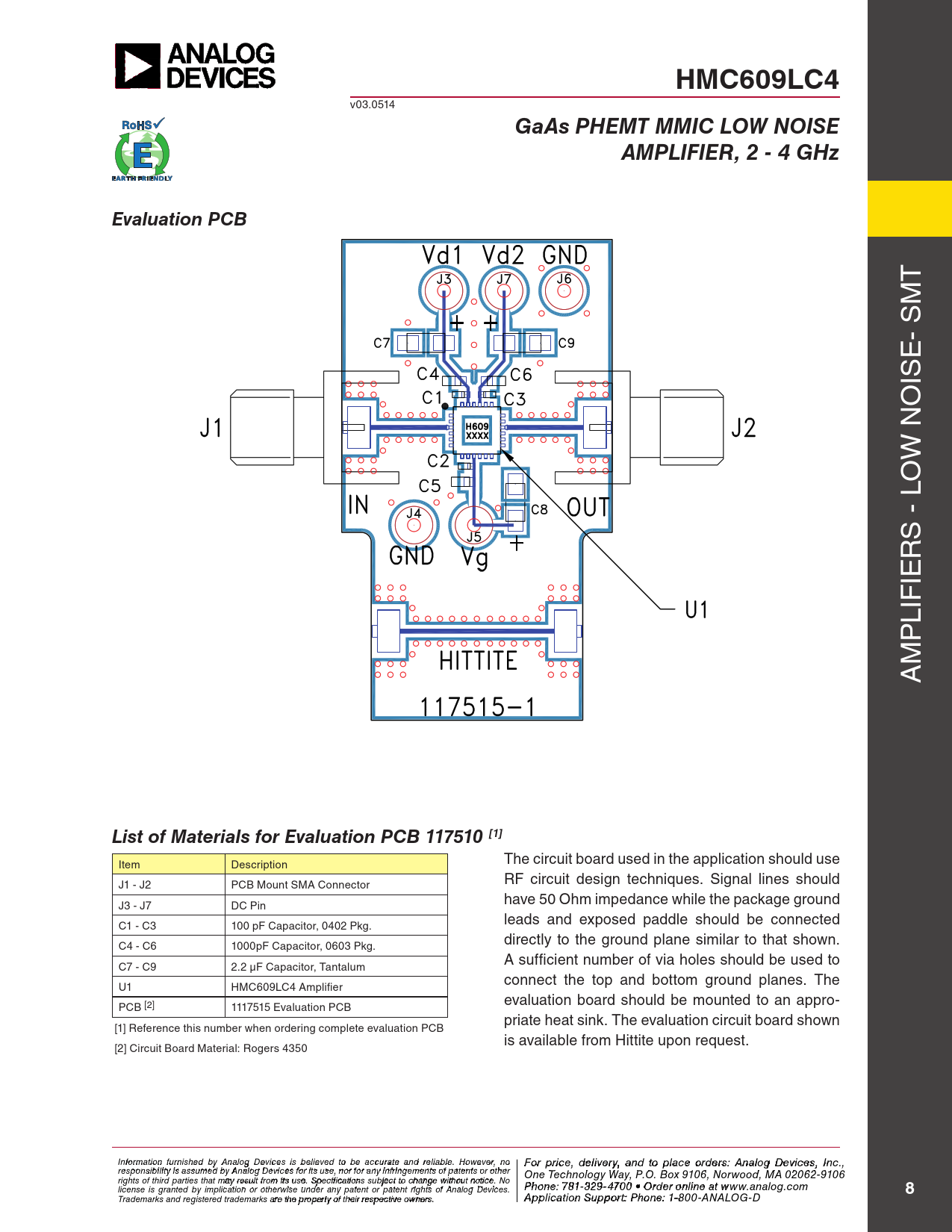 HMC609LC4. GaAs PHEMT MMIC LOW NOISE. AMPLIFIER, 2 - 4 GHz. Evaluation PCB. List of Materials for Evaluation PCB 117510 [1]