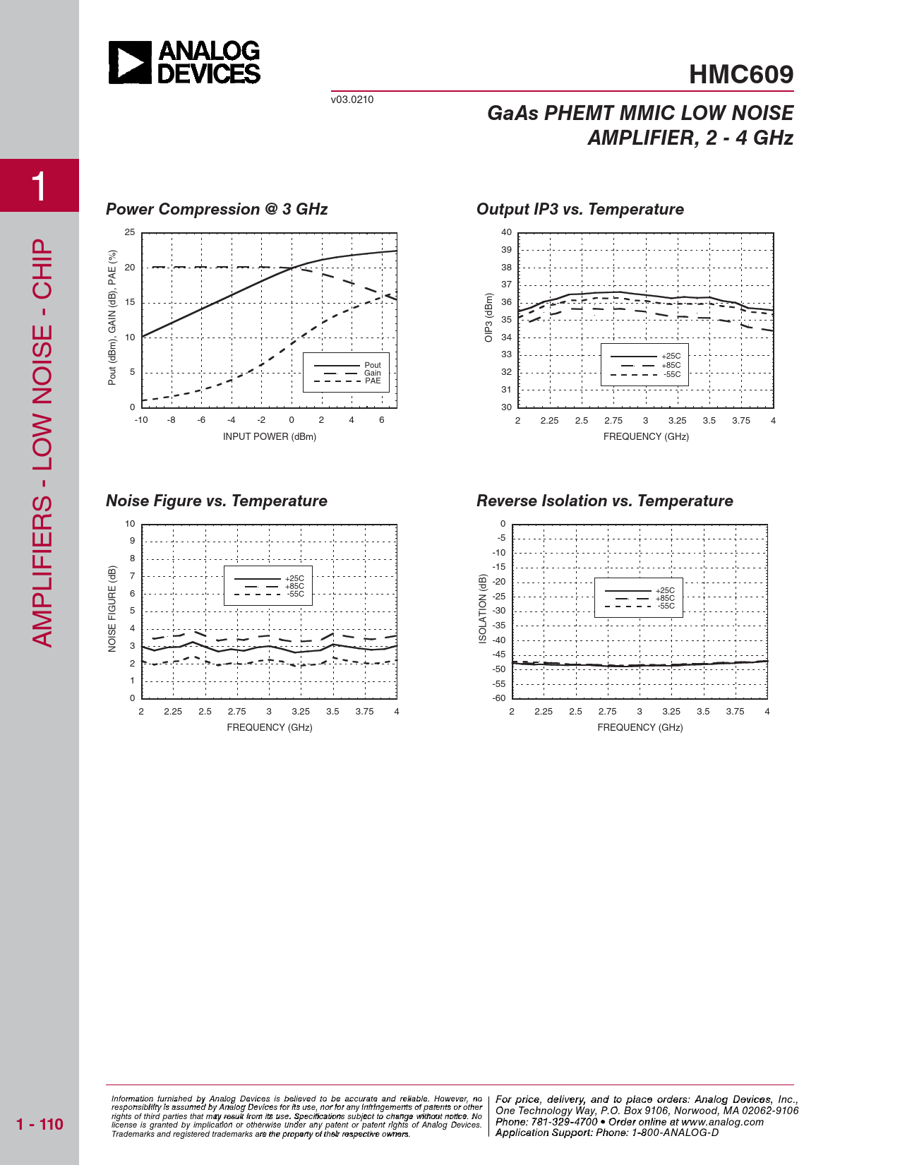 HMC609 v03.0210 GaAs PHEMT MMIC LOW NOISEAMPLIFIER, 2 - 4 GHz 1 Power Compression @ 3 GHzOutput IP3 vs. Temperature 25 40 IP 39 H 20 38 37 15 36 35 E - C 10 34 OIP3 (dBm) IS 33 +25C Pout +85C 5 Gain 32 -55C PAE Pout (dBm), GAIN (dB), PAE (%) 31 0 30 W NO -10 -8 -6 -4 -2 0 2 4 6 2 2.25 2.5 2.75 3 3.25 3.5 3.75 4 INPUT POWER (dBm) FREQUENCY (GHz) O S - L Noise Figure vs. TemperatureReverse Isolation vs. Temperature R 10 0 IE -5 9 -10 IF 8 -15 L 7 +25C -20 +85C P +25C 6 -55C -25 +85C -55C GURE (dB) M 5 -30 -35 A 4 SE FI ISOLATION (dB) -40 3 NOI -45 2 -50 1 -55 0 -60 2 2.25 2.5 2.75 3 3.25 3.5 3.75 4 2 2.25 2.5 2.75 3 3.25 3.5 3.75 4 FREQUENCY (GHz) FREQUENCY (GHz) Inf F or o mar pr tion f ic ur e, de nished bliy ve An ralyo a g n De d to p vices is lbaelc ie e o ved trde o b r e s a : H ccuraittt e itae M nd reliicr abl ow e. H a o v we e C ver, noo rpo F roa r ti p o ri n c , e 2 , d0el A iv lepha R ry, and otad, C o plac h e e o lm rde s rsfo : rd, MA 01 Analog Devi 8 c 2 es 4 , Inc., responsibility is assumed by Analog Devices for its use, nor for any infringements of patents or other One Technology Way, P.O. Box 9106, Norwood, MA 02062-9106 rights of third parties that may result from its use. Specifications subject to change without notice. No 1 - 110 Phone: 978-250-3343 Fax: 978-250-3373 O P rde hon r O e: 7 n 81 - - l3in 2 e a 9-47 t w 0 ww 0 • O . rd h e itt r o i nte lin .co e a m license is granted by implication or otherwise under any patent or patent rights of Analog Devices. t www.analog.com Application Support: Phon Trademarks and registered trademarks are the property of their respective owners. e: 978-250-334 A 3 o pplic r app ation Su sp@ pohrtitti : P te ho .c ne om : 1-800-ANALOG-D