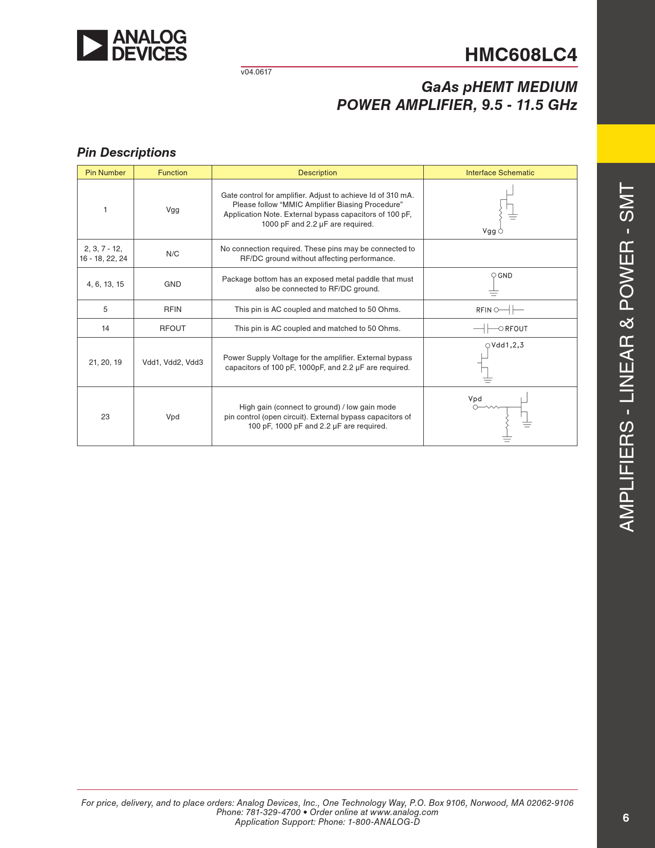 HMC608LC4 GaAs pHEMT MEDIUM POWER AMPLIFIER, 9.5 - 11.5 GHz Pin Descriptions