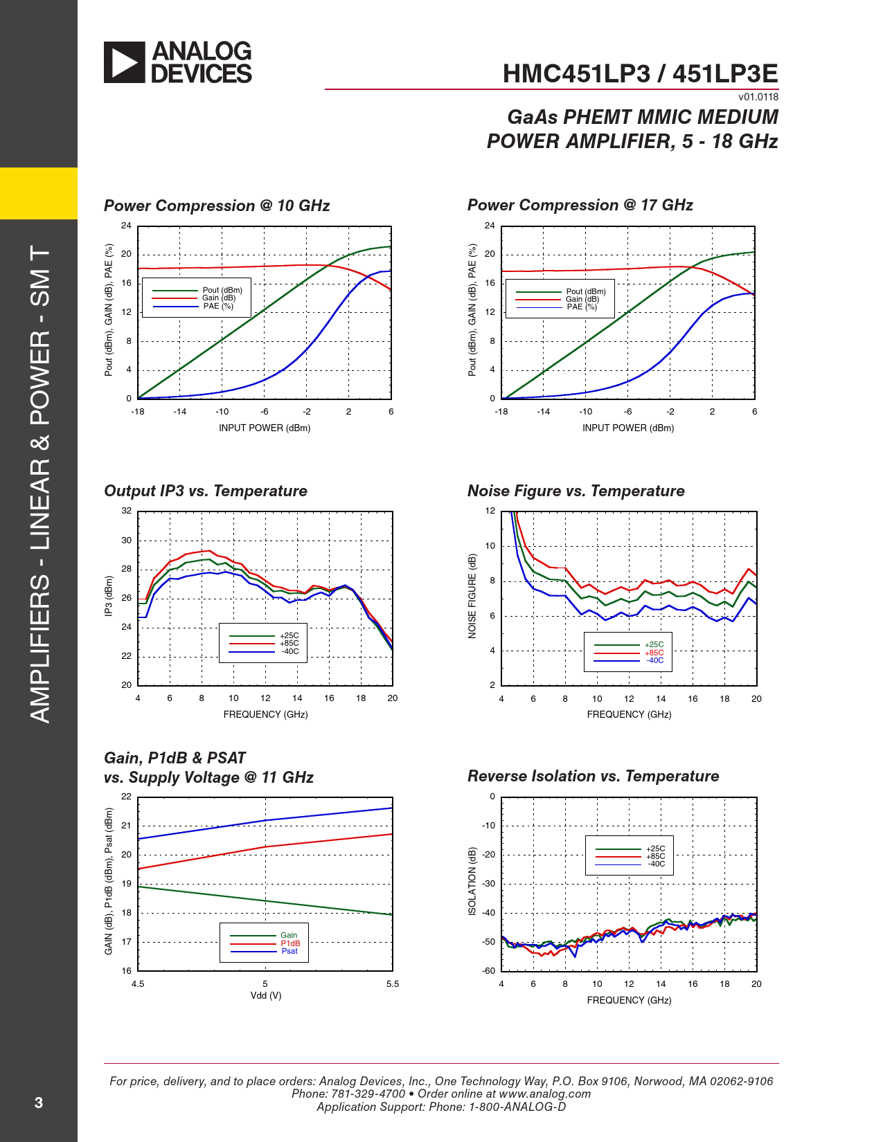 HMC451LP3 / 451LP3E v01.0118 GaAs PHEMT MMIC MEDIUMPOWER AMPLIFIER, 5 - 18 GHzPower Compression @ 10 GHzPower Compression @ 17 GHz 24 24 ) T % 20 % ( 20 ( E E m A A s ), P 16 ), P 16 B Pout (dBm) B d Pout (dBm) Gain (dB) d ( Gain (dB) PAE (%) IN PAE (%) 12 IN A 12 A r - ), G ), G m 8 m 8 e B B d d t ( t ( u u w o 4 o P 4 P o 0 0 p -18 -14 -10 -6 -2 2 6 -18 -14 -10 -6 -2 2 6 INPUT POWER (dBm) INPUT POWER (dBm) r & A e Output IP3 vs. TemperatureNoise Figure vs. Temperature 32 12 lin 30 10 ) B d s - 28 ( ) E m 8 R r U (dB 26 IG 3 F ie IP E 6 IS 24 O +25C N +85C lif +25C -40C 4 22 +85C -40C p m 20 2 4 6 8 10 12 14 16 18 20 4 6 8 10 12 14 16 18 20 A FREQUENCY (GHz) FREQUENCY (GHz) Gain, P1dB & PSAT vs. Supply Voltage @ 11 GHzReverse Isolation vs. Temperature 22 0 ) m B d 21 -10 t ( a s ) +25C 20 B ), P -20 +85C d m ( -40C B N d ( 19 IO -30 B T d A 1 L O ), P 18 IS -40 B d ( Gain IN 17 P1dB A -50 Psat G 16 -60 4.5 5 5.5 4 6 8 10 12 14 16 18 20 Vdd (V) FREQUENCY (GHz) For price, delivery, and to place orders: Analog Devices, Inc., One Technology Way, P.O. Box 9106, Norwood, MA 02062-9106 Phone: 781-329-4700 • Order online at www.analog.com 3 Application Support: Phone: 1-800-ANALOG-D