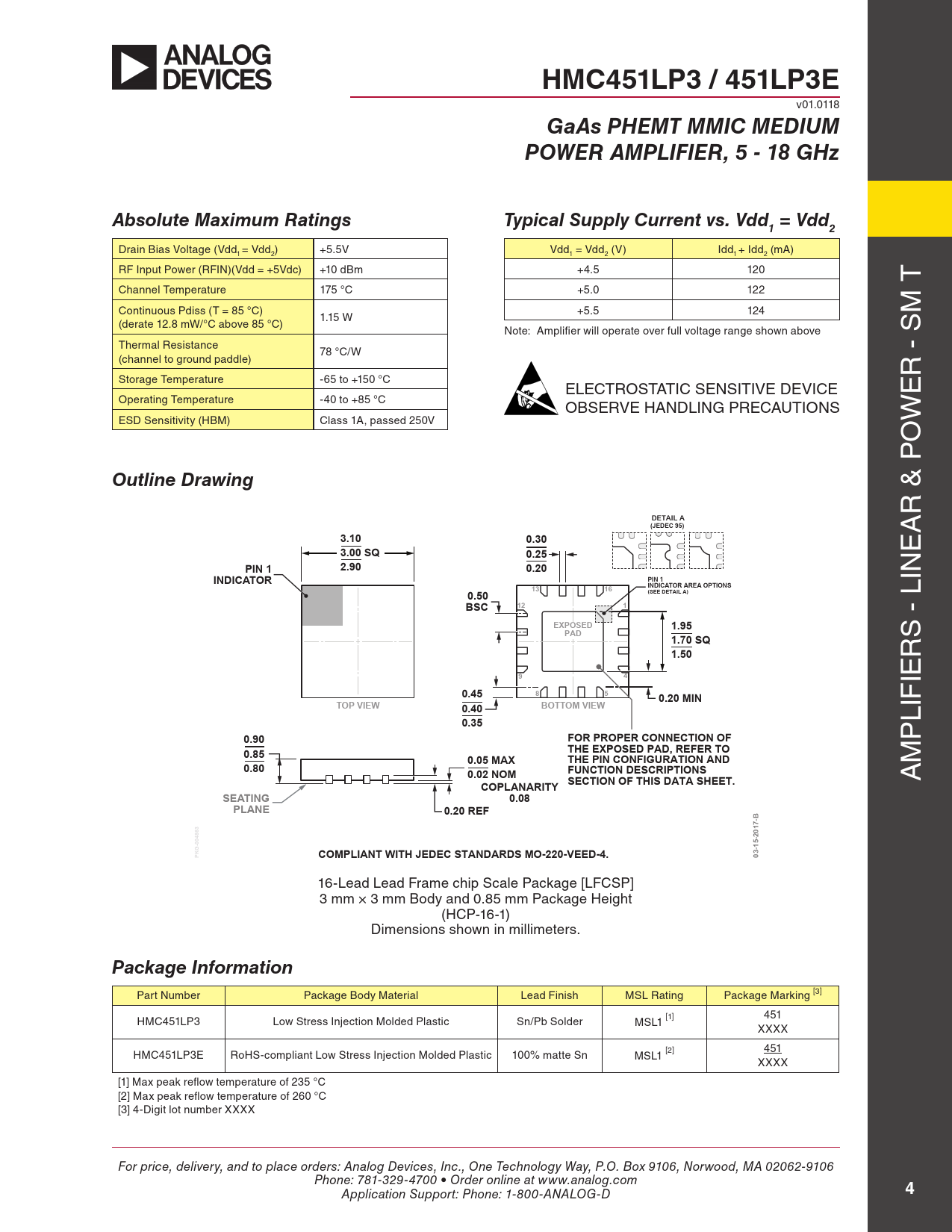 HMC451LP3 / 451LP3E v01.0118 GaAs PHEMT MMIC MEDIUMPOWER AMPLIFIER, 5 - 18 GHzAbsolute Maximum RatingsTypical Supply Current vs. Vdd = Vdd12 Drain Bias Voltage (Vdd = Vdd ) +5.5V Vdd = Vdd (V) idd + idd (mA) 1 2 1 2 1 2 rf input power (rfin)(Vdd = +5Vdc) +10 dBm +4.5 120 Channel Temperature 175 °C +5.0 122 T Continuous pdiss (T = 85 °C) +5.5 124 m 1.15 w (derate 12.8 mw/°C above 85 °C) note: Amplifier will operate over full voltage range shown above s Thermal resistance 78 °C/w (channel to ground paddle) r - storage Temperature -65 to +150 °C eleCTrosTATiC sensiTiVe DeViCe e operating Temperature -40 to +85 °C oBserVe HAnDlinG preCAUTions esD sensitivity (HBm) Class 1A, passed 250V w 16-Lead Lead Frame Chip Scale Package [LFCSP] o 3 x 3 mm Body and 0.85 mm Package Height p (HCP-16-1)Outline DrawingDimensions shown in millimeters r & DETAIL A(JEDEC 95) A 3.100.303.00 SQ e 0.25PIN 12.900.20INDICATORPIN 11316INDICATOR AREA OPTIONS(SEE DETAIL A) lin 0.50121BSCEXPOSED1.95PAD s - 1.70 SQ1.50 r 94 ie 0.45850.20 MINTOP VIEWBOTTOM VIEW0.400.35 lif 0.90FOR PROPER CONNECTION OF p 0.85THE EXPOSED PAD, REFER TO0.05 MAXTHE PIN CONFIGURATION AND m 0.800.02 NOMFUNCTION DESCRIPTIONSSECTION OF THIS DATA SHEET. A COPLANARITYSEATING0.08PLANE0.20 REFPKG-004863COMPLIANT WITH JEDEC STANDARDS MO-220-VEED-4.03-15-2017-B 16-lead lead frame chip scale package [lfCsp] 3 mm × 3 mm Body and 0.85 mm package Height (HCp-16-1) Dimensions shown in mil imeters. Package Information part number package Body material lead finish msl rating package marking [3] HmC451lp3 low stress injection molded plastic sn/pb solder msl1 [1] 451 XXXX HmC451lp3e roHs-compliant low stress injection molded plastic 100% matte sn msl1 [2] 451 XXXX [1] max peak reflow temperature of 235 °C [2] max peak reflow temperature of 260 °C [3] 4-Digit lot number XXXX For price, delivery, and to place orders: Analog Devices, Inc., One Technology Way, P.O. Box 9106, Norwood, MA 02062-9106 Phone: 781-329-4700 • Order online at www.analog.com Application Support: Phone: 1-800-ANALOG-D 4