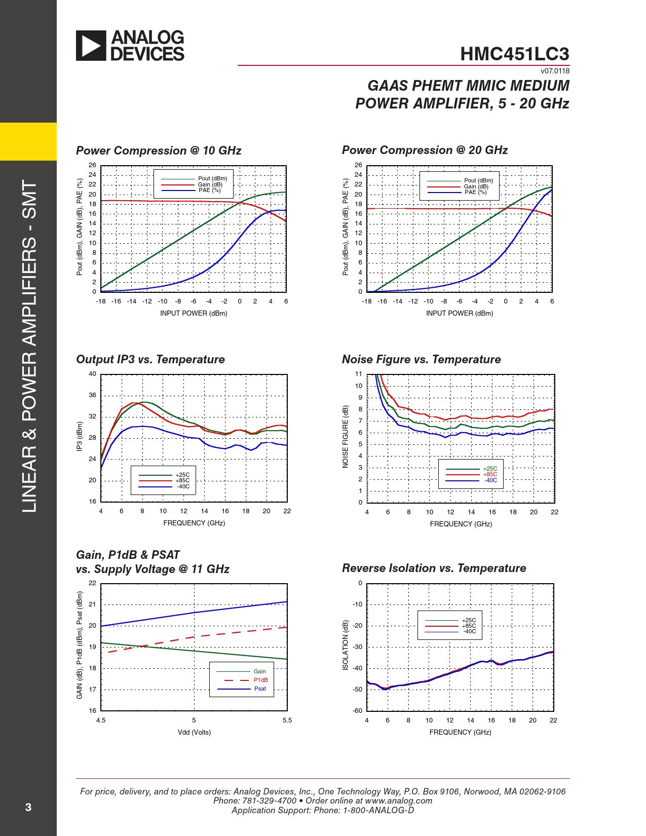 22 0 ) m B d 21 -10 t ( a s ) +25C 20 B -20 +85C ), P d -40C ( m B N d IO ( 19 -30 T B A d L 1 O ), P 18 IS -40 Gain B d P1dB ( IN 17 Psat -50 A G 16 -60 4.5 5 5.5 4 6 8 10 12 14 16 18 20 22 Vdd (Volts) FREQUENCY (GHz) For price, delivery, and to place orders: Analog Devices, Inc., One Technology Way, P.O. Box 9106, Norwood, MA 02062-9106 Phone: 781-329-4700 • Order online at www.analog.com