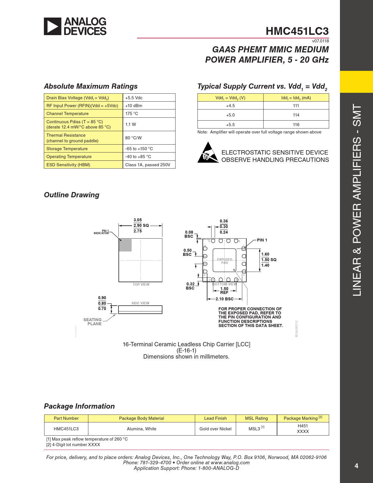 HMC451LC3 v07.0118 Gaas PHEMT MMIC MEDIUMPOWER aMPLIFIER, 5 - 20 GHzabsolute Maximum RatingsTypical supply Current vs. Vdd = Vdd12 Drain Bias Voltage (Vdd = Vdd ) +5.5 Vdc Vdd = Vdd (V) Idd = Idd (mA) 1 2 1 2 1 2 RF Input Power (RFIN)(Vdd = +5Vdc) +10 dBm +4.5 111 T Channel Temperature 175 °C +5.0 114 M Continuous Pdiss (T = 85 °C) 1.1 W +5.5 116 (derate 12.4 mW/°C above 85 °C) Note: Amplifier will operate over full voltage range shown above Thermal Resistance 80 °C/W (channel to ground paddle) S - S Storage Temperature -65 to +150 °C R ELECTROSTATIC SENSITIVE DEVICE Operating Temperature -40 to +85 °C OBSERVE HANDLING PRECAUTIONS IE ESD Sensitivity (HBM) Class 1A, passed 250V LIF 16-Terminal Ceramic Leadless Chip Carrier [LCC] P (E-16-1) M Outline DrawingDimensions shown in millimeters. R A E 3.050.362.90 SQ0.30 W PIN 12.75INDICATOR0.080.24BSC O 1316PIN 11210.50BSC1.60EXPOSED1.50 SQPAD1.40 R & P A 9485 E TOP VIEW0.32BOTTOM VIEWBSC1.50REF LIN 0.902.10 BSC0.80SIDE VIEW0.70FOR PROPER CONNECTION OFTHE EXPOSED PAD, REFER TOTHE PIN CONFIGURATION ANDSEATINGFUNCTION DESCRIPTIONSPLANESECTION OF THIS DATA SHEET.PKG-00483802-24-2017-C 16-Terminal Ceramic Leadless Chip Carrier [LCC] (E-16-1) Dimensions shown in mil imeters. Package Information Part Number Package Body Material Lead Finish MSL Rating Package Marking [2] HMC451LC3 Alumina, White Gold over Nickel MSL3 [1] H451 XXXX [1] Max peak reflow temperature of 260 °C [2] 4-Digit lot number XXXX For price, delivery, and to place orders: Analog Devices, Inc., One Technology Way, P.O. Box 9106, Norwood, MA 02062-9106 Phone: 781-329-4700 • Order online at www.analog.com Application Support: Phone: 1-800-ANALOG-D 4