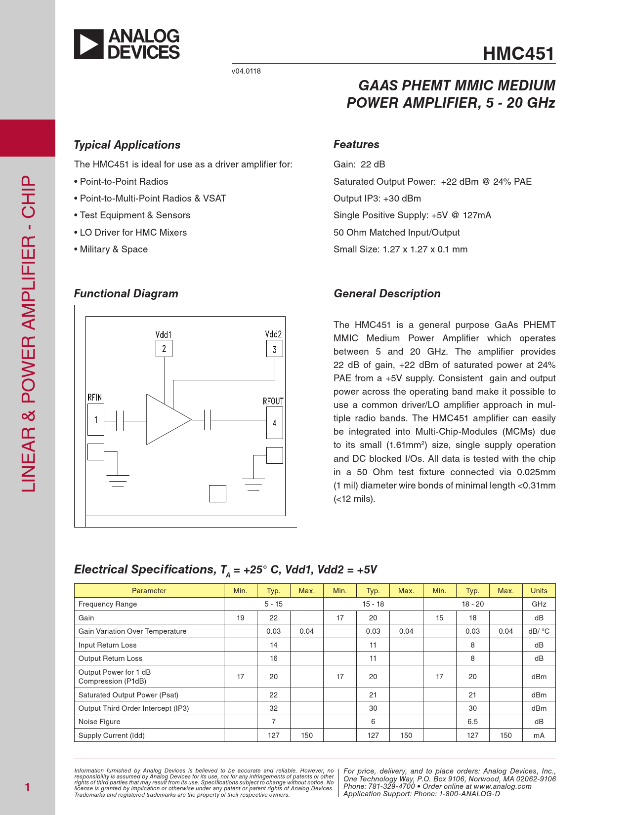 HMC451. GAAS PHEMT MMIC MEDIUM. POWER AMPLIFIER, 5 - 20 GHz. Typical Applications. Features. Functional Diagram