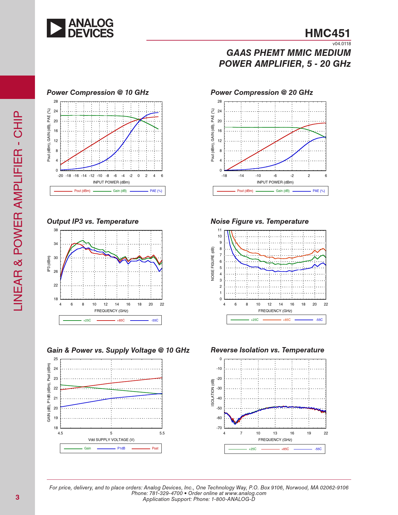 25 0 ) m B 24 -10 d t ( a s 23 ) -20 B ), P d ( m B 22 N -30 d IO ( T B A d 21 L -40 1 O ), P IS B 20 -50 d ( IN A 19 -60 G 18 -70 4.5 5 5.5 4 7 10 13 16 19 22 Vdd SUPPLY VOLTAGE (V) FREQUENCY (GHz) Gain P1dB Psat +25C +85C -55C For price, delivery, and to place orders: Analog Devices, Inc., One Technology Way, P.O. Box 9106, Norwood, MA 02062-9106 Phone: 781-329-4700 • Order online at www.analog.com