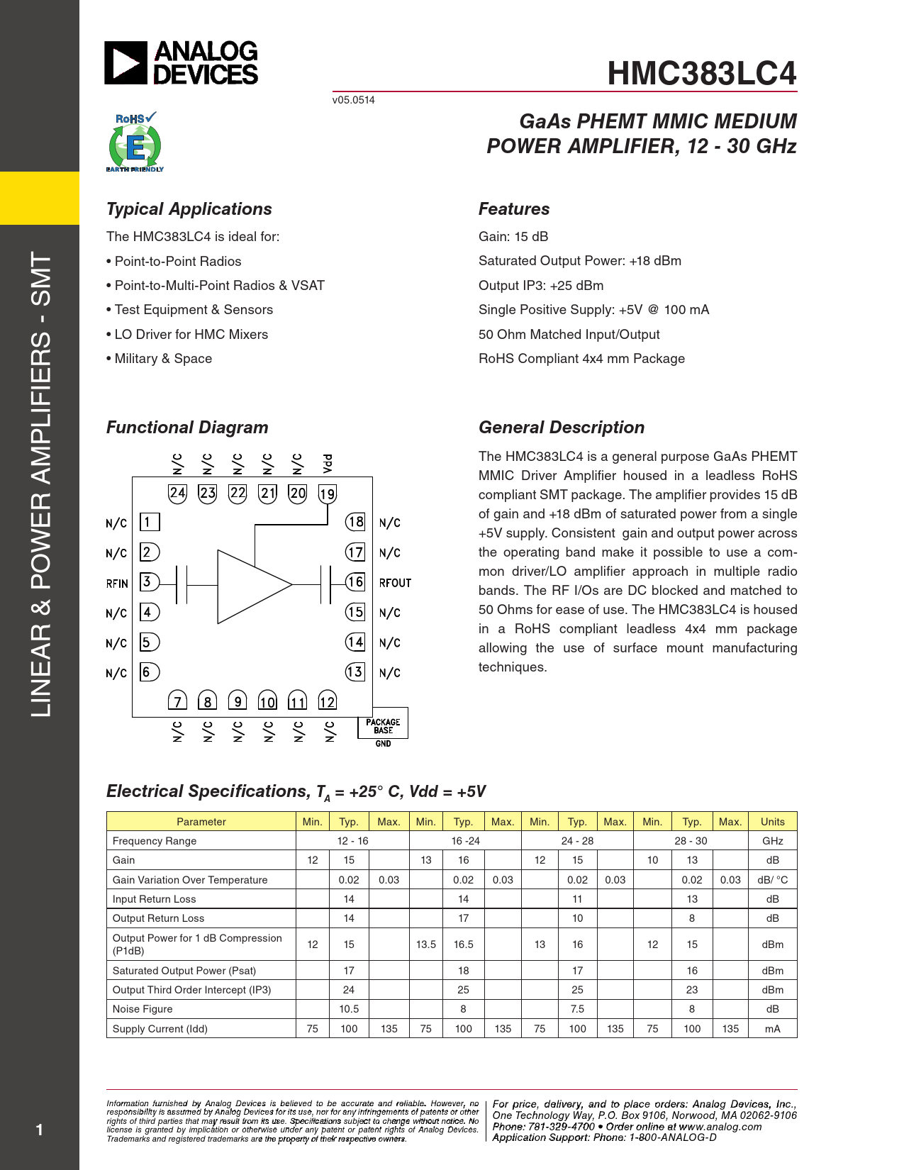 HMC383LC4. GaAs PHEMT MMIC MEDIUM. POWER AMPLIFIER, 12 - 30 GHz. Typical Applications. Features. Functional Diagram
