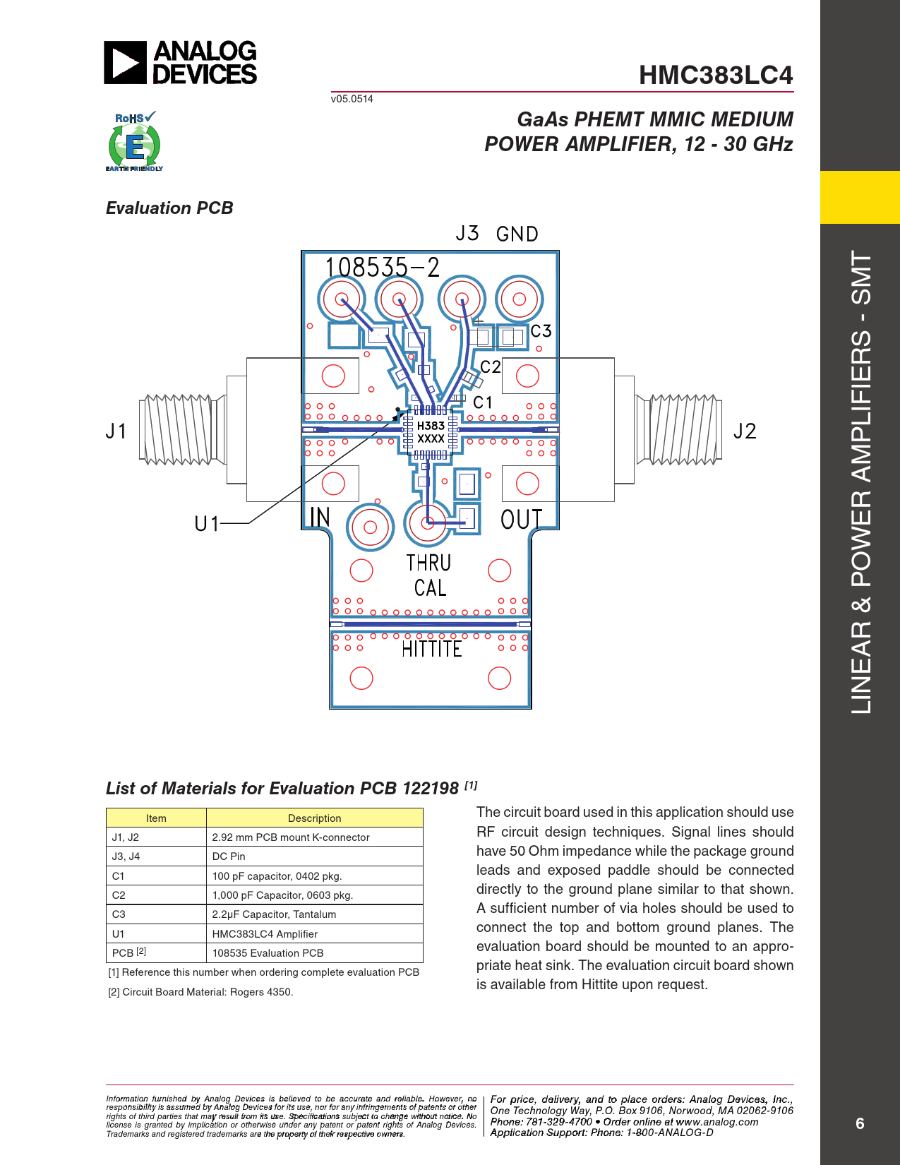 HMC383LC4. GaAs PHEMT MMIC MEDIUM. POWER AMPLIFIER, 12 - 30 GHz. Evaluation PCB