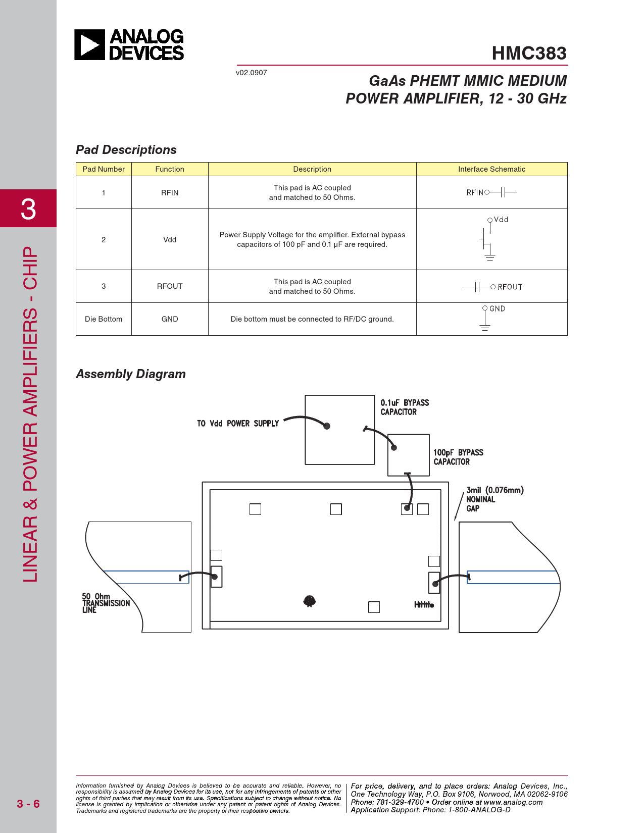 HMC383. GaAs PHEMT MMIC MEDIUM. POWER AMPLIFIER, 12 - 30 GHz. Pad Descriptions. Assembly Diagram. 3 - 6
