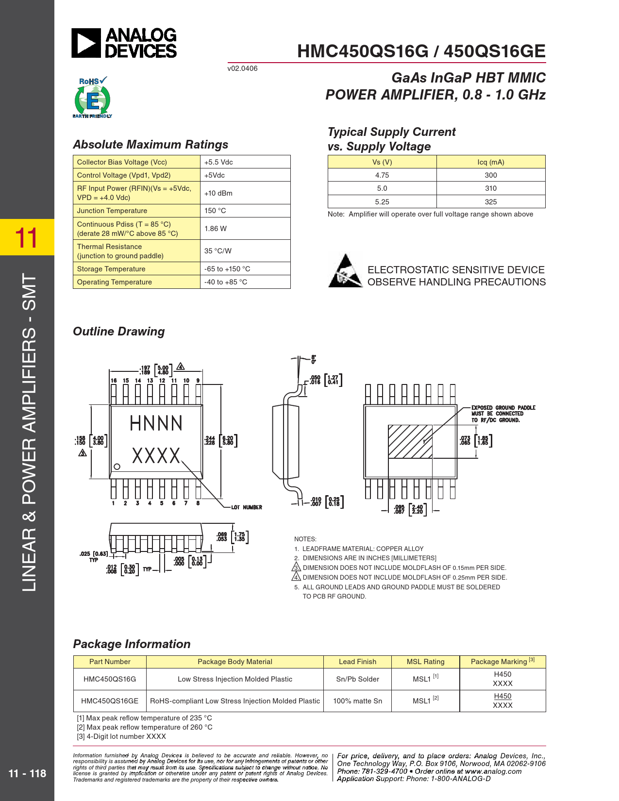 HMC450QS16G / 450QS16GE. GaAs InGaP HBT MMIC. POWER AMPLIFIER, 0.8 - 1.0 GHz. Typical Supply Current. Absolute Maximum Ratings