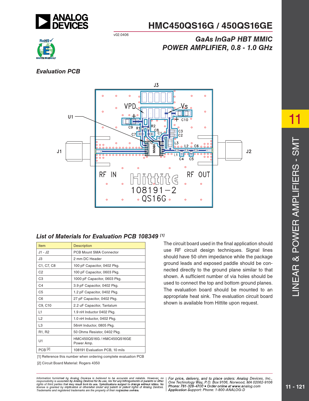 HMC450QS16G / 450QS16GE v02.0406 GaAs InGaP HBT MMICPOWER AMPLIFIER, 0.8 - 1.0 GHzEvaluation PCB 11 T - SM S R IE IF L P M R A E List of Materials for Evaluation PCB 108349 [1] W The circuit board used in the fi nal application should Item Description O use RF circuit design techniques. Signal lines J1 - J2 PCB Mount SMA Connector should have 50 ohm impedance while the package J3 2 mm DC Header ground leads and exposed paddle should be con- & P C1, C7, C8 100 pF Capacitor, 0402 Pkg. nected directly to the ground plane similar to that R C2 100 pF Capacitor, 0603 Pkg. shown. A sufficient number of via holes should be A C3 1000 pF Capacitor, 0603 Pkg. E used to connect the top and bottom ground planes. C4 3.9 pF Capacitor, 0402 Pkg. The evaluation board should be mounted to an C5 1.2 pF Capacitor, 0402 Pkg. IN appropriate heat sink. The evaluation circuit board L C6 27 pF Capacitor, 0402 Pkg. shown is available from Hittite upon request. C9, C10 2.2 uF Capacitor, Tantalum L1 1.9 nH Inductor 0402 Pkg. L2 1.0 nH Inductor, 0402 Pkg. L3 56nH Inductor, 0805 Pkg. R1, R2 50 Ohms Resistor, 0402 Pkg. HMC450QS16G / HMC450QS16GE U1 Power Amp. PCB [2] 108191 Evaluation PCB, 10 mils [1] Reference this number when ordering complete evaluation PCB [2] Circuit Board Material: Rogers 4350 Information furnish F e o d r pri by An ce, de alog Devic leis vie s rbyeli, a eve nd to pla d to be accur ce o ate an r d der relia s ble , pl . Ho ease co wever, no For price, delivery, and to place orders: Analog Devices, Inc., responsibility is assumed by Analog Devices for its use, nor for any infringements of patents or other ntact Hittite Microwave Corporation: One Technology Way, P.O. Box 9106, Norwood, MA 02062-9106 20 Alpha Road, Chelmsford, MA 01824 Phone rights of third parties that may result from its use. Specifications subject to change without notice. No license is granted by implication or otherwise under any patent or patent rights of Analog Devices. : 978 Pho - n 25 e: 7 0- 81 33 2 4 9- 3 F 470 ax: 978 0 • Order o - n 25 lin 0 e a-t 3373 www.analog.com 11 - 121 Order On- Trademarks and registered trademarks are the property of their respective owners. line at www.hi A tptipte.co licatio m n Support: Phone: 1-800-ANALOG-D