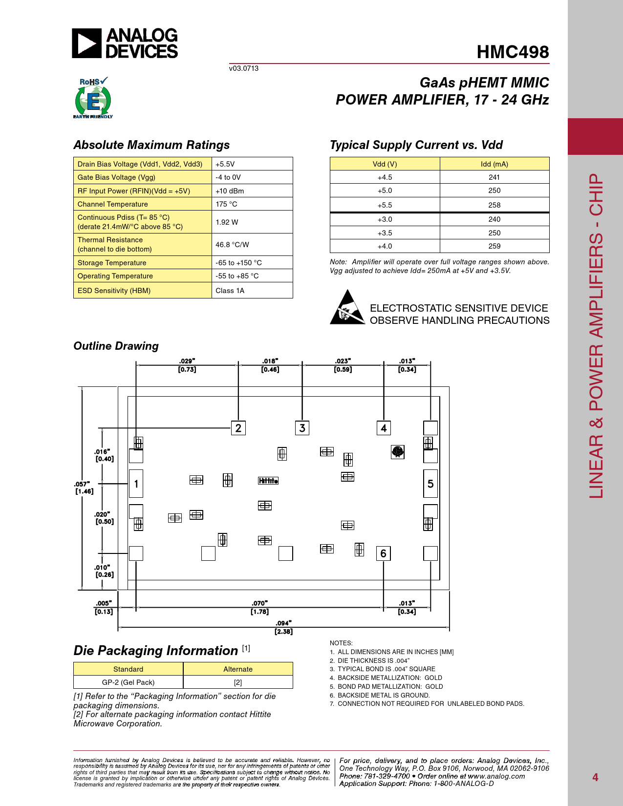 HMC498. GaAs pHEMT MMIC. POWER AMPLIFIER, 17 - 24 GHz. Absolute Maximum Ratings. Typical Supply Current vs. Vdd. Outline Drawing