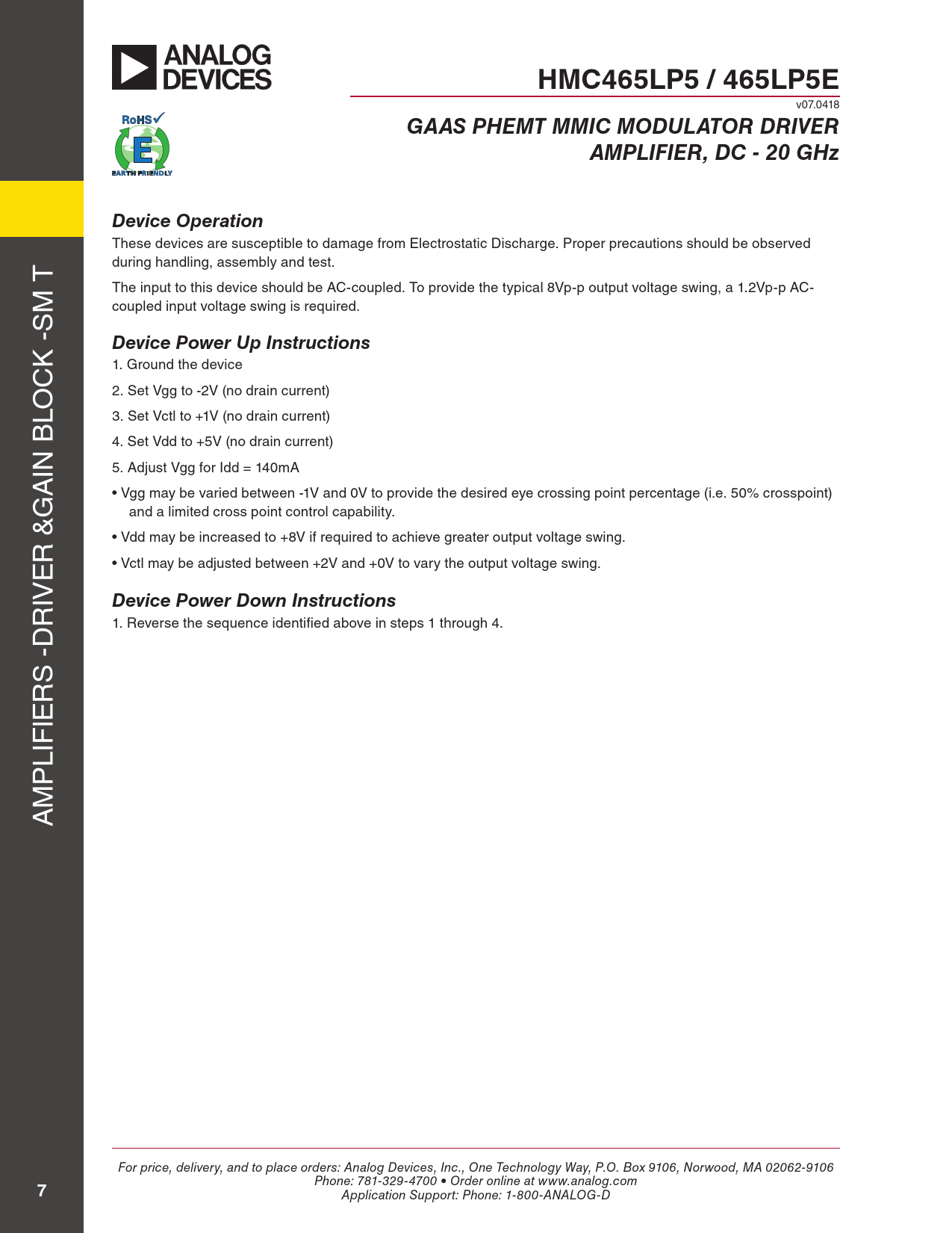 HMC465LP5 / 465LP5E. GAAS PHEMT MMIC MODULATOR DRIVER. AMPLIFIER, DC - 20 GHz. Device Operation. Device Power Up Instructions