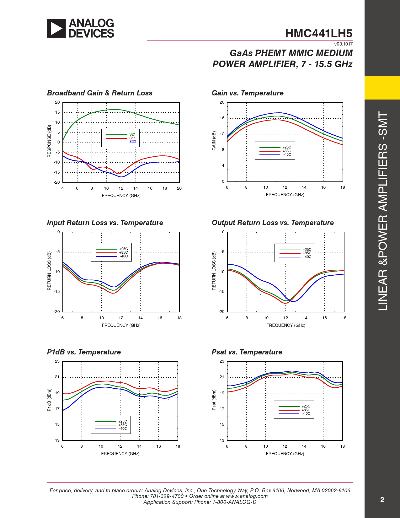HMC441LH5. GaAs PHEMT MMIC MEDIUM. POWER AMPLIFIER, 7 - 15.5 GHz. Broadband Gain & Return Loss. Gain vs. Temperature
