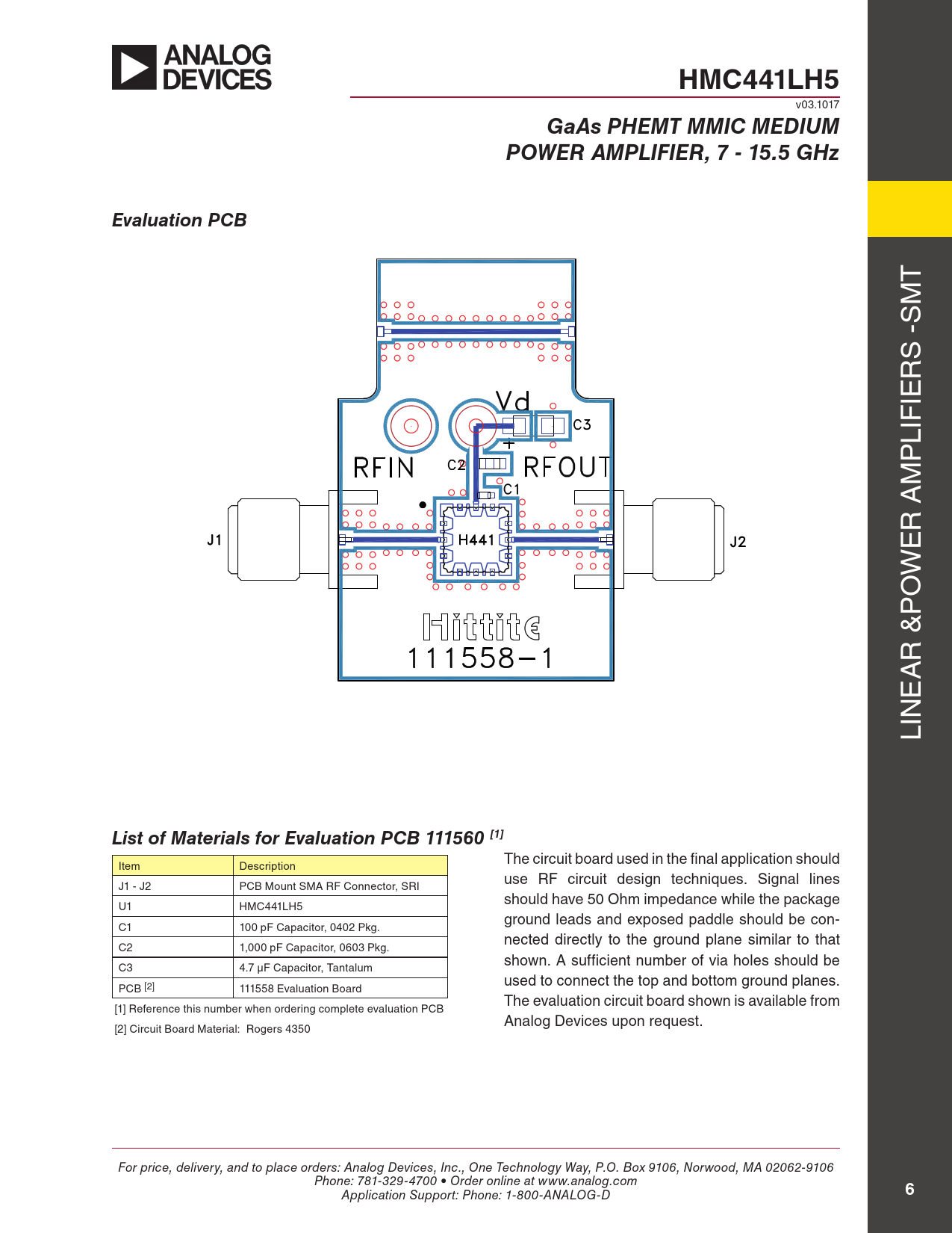 HMC441LH5. GaAs PHEMT MMIC MEDIUM. POWER AMPLIFIER, 7 - 15.5 GHz. Evaluation PCB