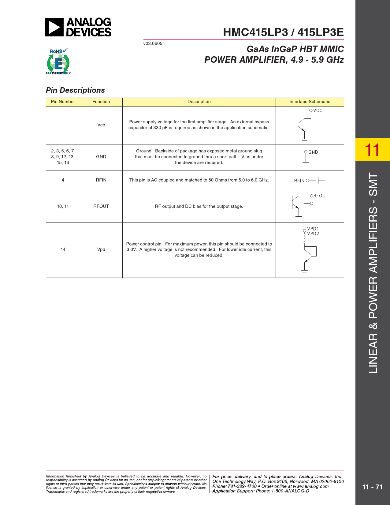 HMC415LP3 / 415LP3E. GaAs InGaP HBT MMIC. POWER AMPLIFIER, 4.9 - 5.9 GHz. Pin Descriptions. 11 - 71