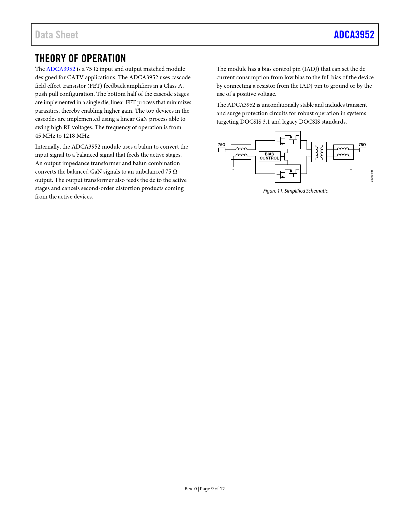 Data SheetADCA3952THEORY OF OPERATION The ADCA3952 is a 75 Ω input and output matched module The module has a bias control pin (IADJ) that can set the dc designed for CATV applications. The ADCA3952 uses cascode current consumption from low bias to the ful bias of the device field effect transistor (FET) feedback amplifiers in a Class A, by connecting a resistor from the IADJ pin to ground or by the push pul configuration. The bottom half of the cascode stages use of a positive voltage. are implemented in a single die, linear FET process that minimizes The ADCA3952 is unconditional y stable and includes transient parasitics, thereby enabling higher gain. The top devices in the and surge protection circuits for robust operation in systems cascodes are implemented using a linear GaN process able to targeting DOCSIS 3.1 and legacy DOCSIS standards. swing high RF voltages. The frequency of operation is from 45 MHz to 1218 MHz. Internally, the ADCA3952 module uses a balun to convert the 75Ω75Ω input signal to a balanced signal that feeds the active stages. BIASCONTROL An output impedance transformer and balun combination converts the balanced GaN signals to an unbalanced 75 Ω 11 0 output. The output transformer also feeds the dc to the active 25050- stages and cancels second-order distortion products coming Figure 11. Simplified Schematic from the active devices. Rev. 0 | Page 9 of 12 Document Outline FEATURES APPLICATIONS GENERAL DESCRIPTION FUNCTIONAL BLOCK DIAGRAM TABLE OF CONTENTS REVISION HISTORY SPECIFICATIONS GENERAL PERFORMANCE DISTORTION DATA (40 MHz TO 550 MHz), ERROR RATES, AND TOTAL COMPOSITE POWER ABSOLUTE MAXIMUM RATINGS ESD CAUTION PIN CONFIGURATION AND FUNCTION DESCRIPTIONS TYPICAL PERFORMANCE CHARACTERISTICS S-PARAMETERS 9 dB TILT PERFORMANCE THEORY OF OPERATION APPLICATIONS INFORMATION OUTLINE DIMENSIONS ORDERING GUIDE