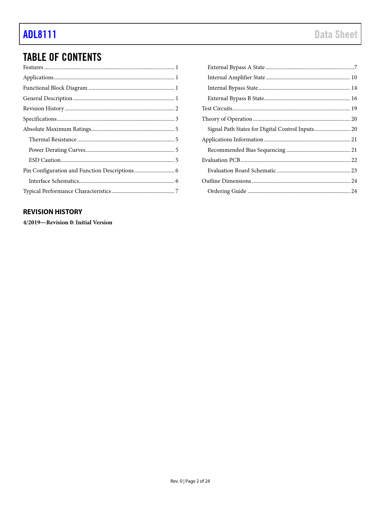 link to page 1 link to page 1 link to page 1 link to page 1 link to page 2 link to page 3 link to page 5 link to page 5 link to page 5 link to page 5 link to page 6 link to page 6 link to page 7 link to page 7 link to page 10 link to page 14 link to page 16 link to page 19 link to page 20 link to page 20 link to page 21 link to page 21 link to page 22 link to page 23 link to page 24 link to page 24 ADL8111Data SheetTABLE OF CONTENTS Features .. 1 External Bypass A State ..7 Applications ... 1 Internal Amplifier State ... 10 Functional Block Diagram .. 1 Internal Bypass State .. 14 General Description ... 1 External Bypass B State .. 16 Revision History ... 2 Test Circuits ... 19 Specifications ... 3 Theory of Operation .. 20 Absolute Maximum Ratings .. 5 Signal Path States for Digital Control Inputs .. 20 Thermal Resistance .. 5 Applications Information .. 21 Power Derating Curves .. 5 Recommended Bias Sequencing .. 21 ESD Caution .. 5 Evaluation PCB ... 22 Pin Configuration and Function Descriptions ... 6 Evaluation Board Schematic ... 23 Interface Schematics... 6 Outline Dimensions ... 24 Typical Performance Characteristics ... 7 Ordering Guide .. 24 REVISION HISTORY 4/2019 ― Revision 0: Initial Version Rev. 0 | Page 2 of 24 Document Outline FEATURES APPLICATIONS FUNCTIONAL BLOCK DIAGRAM GENERAL DESCRIPTION REVISION HISTORY SPECIFICATIONS ABSOLUTE MAXIMUM RATINGS THERMAL RESISTANCE POWER DERATING CURVES ESD CAUTION PIN CONFIGURATION AND FUNCTION DESCRIPTIONS INTERFACE SCHEMATICS TYPICAL PERFORMANCE CHARACTERISTICS EXTERNAL BYPASS A STATE INTERNAL AMPLIFIER STATE INTERNAL BYPASS STATE EXTERNAL BYPASS B STATE TEST CIRCUITS THEORY OF OPERATION SIGNAL PATH STATES FOR DIGITAL CONTROL INPUTS APPLICATIONS INFORMATION RECOMMENDED BIAS SEQUENCING During Power-Up During Power-Down EVALUATION PCB EVALUATION BOARD SCHEMATIC OUTLINE DIMENSIONS ORDERING GUIDE