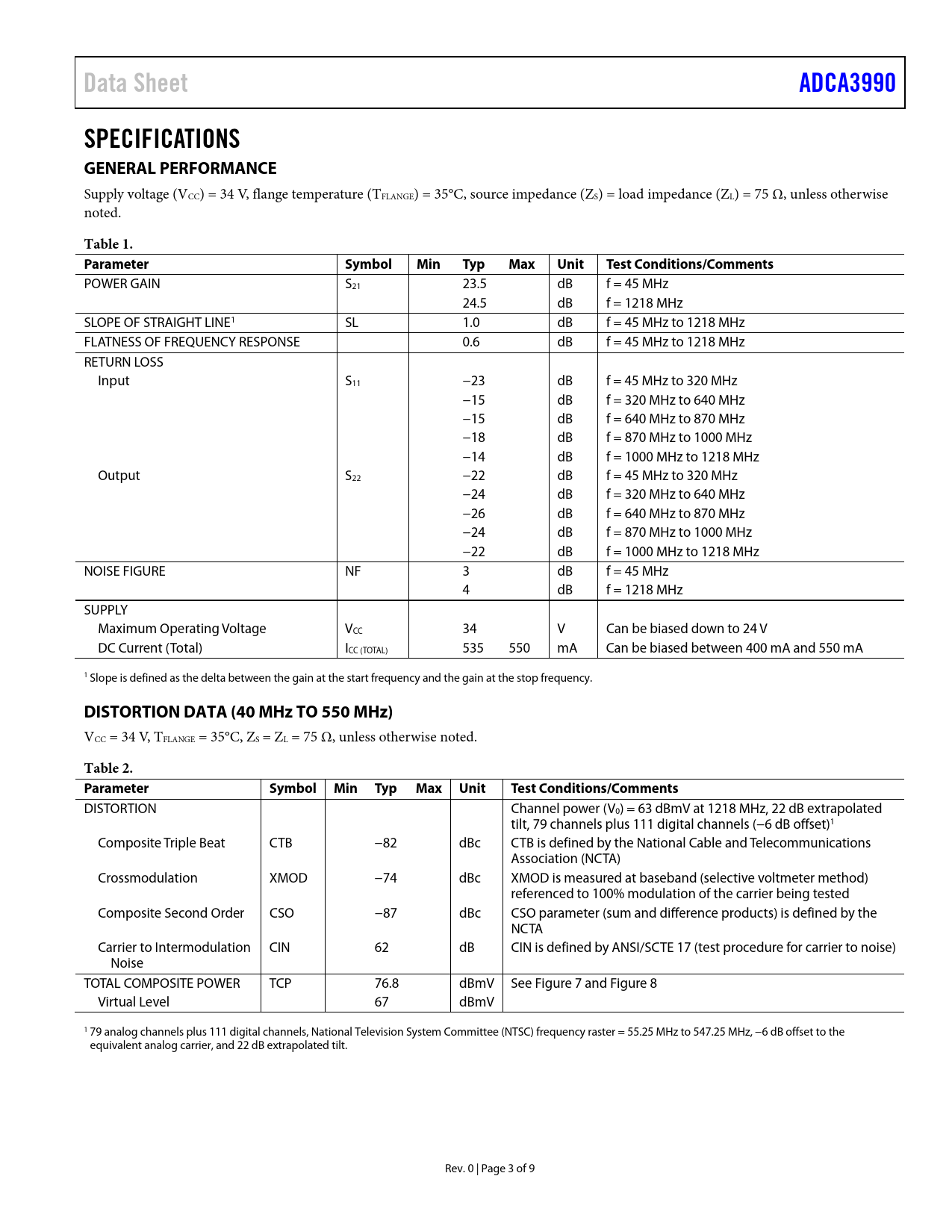 Pages / Page9 / 3 — Data Sheet. ADCA3990. SPECIFICATIONS GENERAL PERFORMANCE. Table 1. …