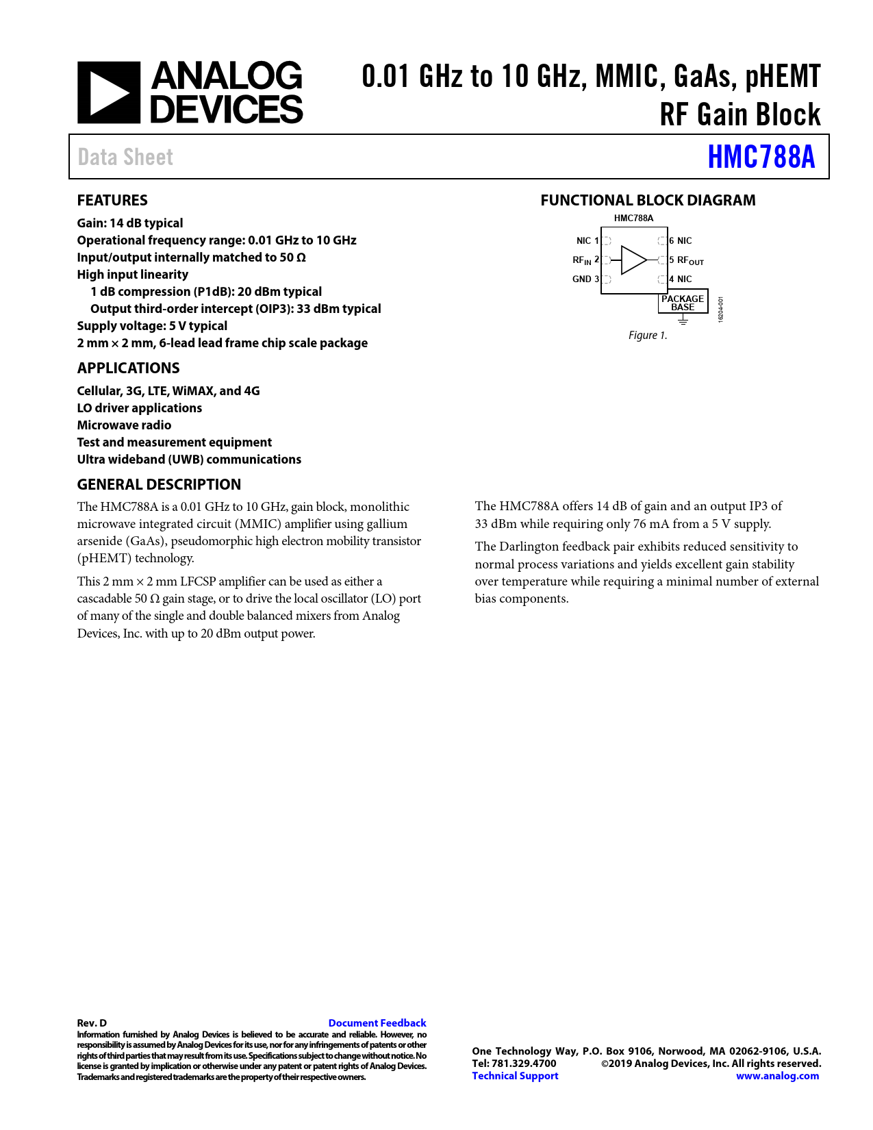 0.01 GHz to 10 GHz, MMIC, GaAs, pHEMT. RF Gain Block. Data Sheet. HMC788A. FEATURES. FUNCTIONAL BLOCK DIAGRAM. Gain: 14 dB typical