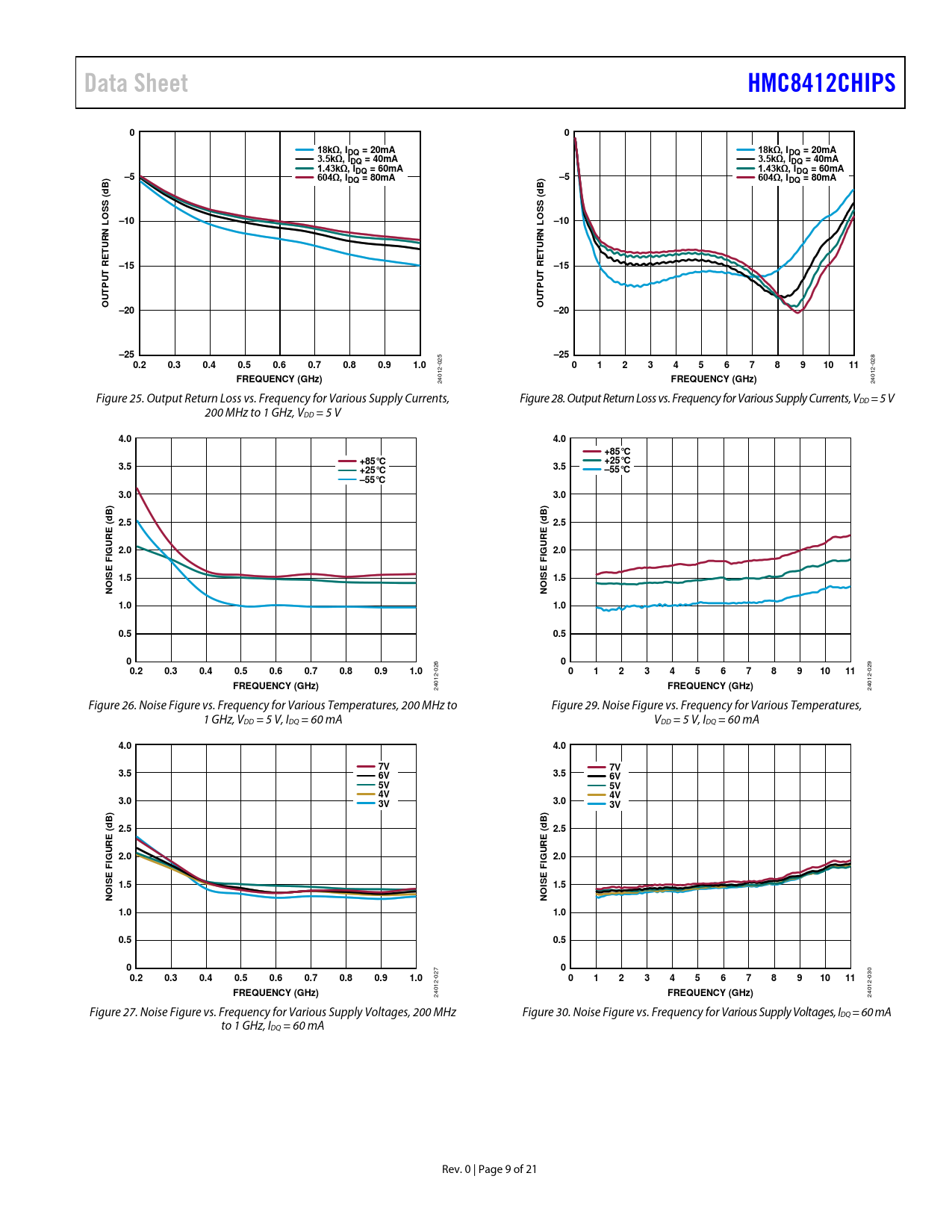 24012- Figure 27. Noise Figure vs. Frequency for Various Supply Voltages, 200 MHz Figure 30. Noise Figure vs. Frequency for Various Supply Voltages, IDQ = 60 mA to 1 GHz, IDQ = 60 mA Rev. 0 | Page 9 of 21 Document Outline Features Applications Functional Block Diagram General Description Revision History Specifications 0.4 GHz to 8 GHz Frequency Range 8 GHz to 10 GHz Frequency Range Absolute Maximum Ratings Thermal Resistance Electrostatic Discharge (ESD) Ratings ESD Ratings for HMC8412CHIPS ESD Caution Pin Configuration and Function Descriptions Interface Schematics Typical Performance Characteristics Small Signal Response Large Signal Response Theory of Operation Applications Information Typical Application Circuit Recommended Bias Sequencing During Power-Up During Power-Down Assembly Diagram Mounting and Bonding Techniques for Millimeter Wave GaAs MMICs Handling Precautions Outline Dimensions Ordering Guide