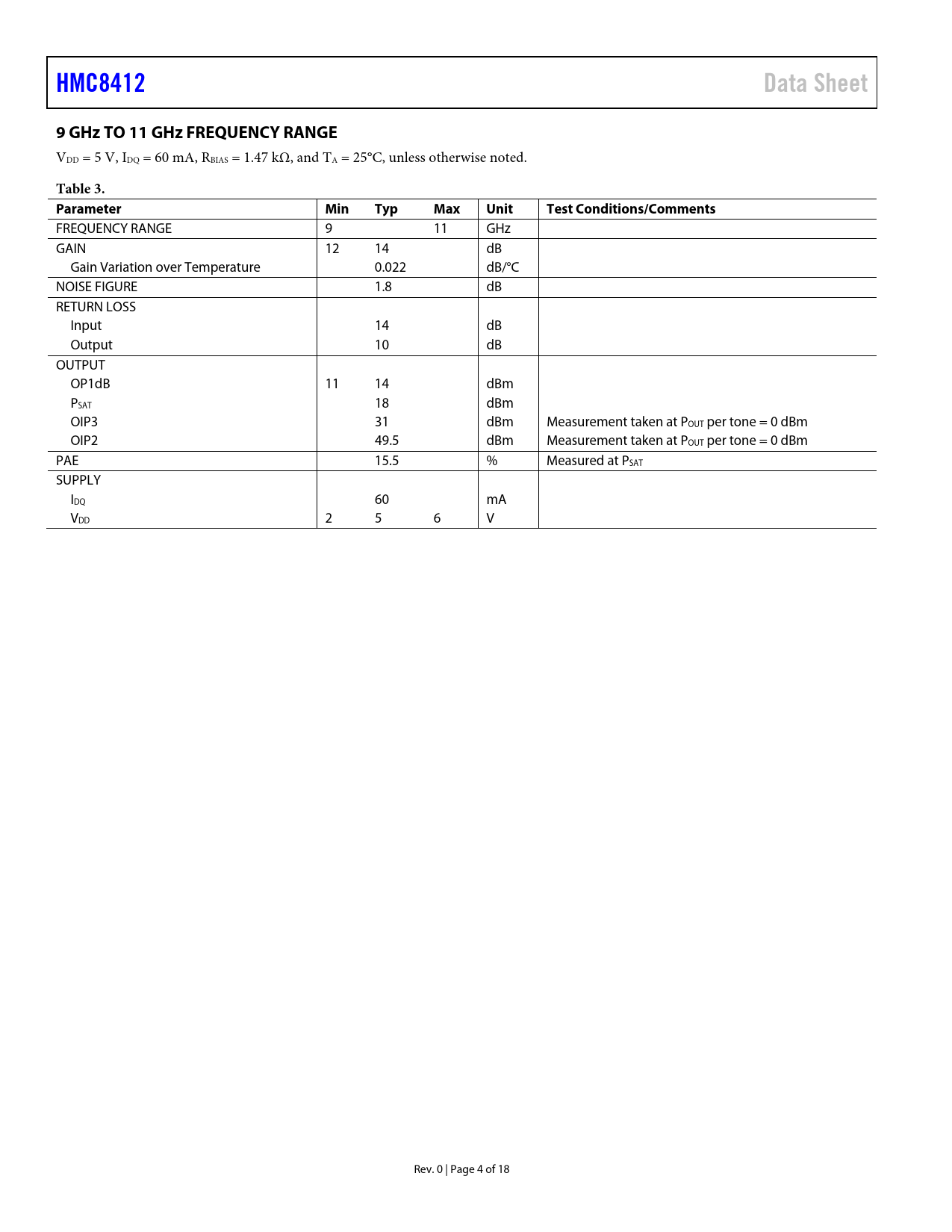 Pages / Page18 / 4 — HMC8412. Data Sheet. 9 GHz TO 11 GHz FREQUENCY RANGE. Table 3. Parameter. …