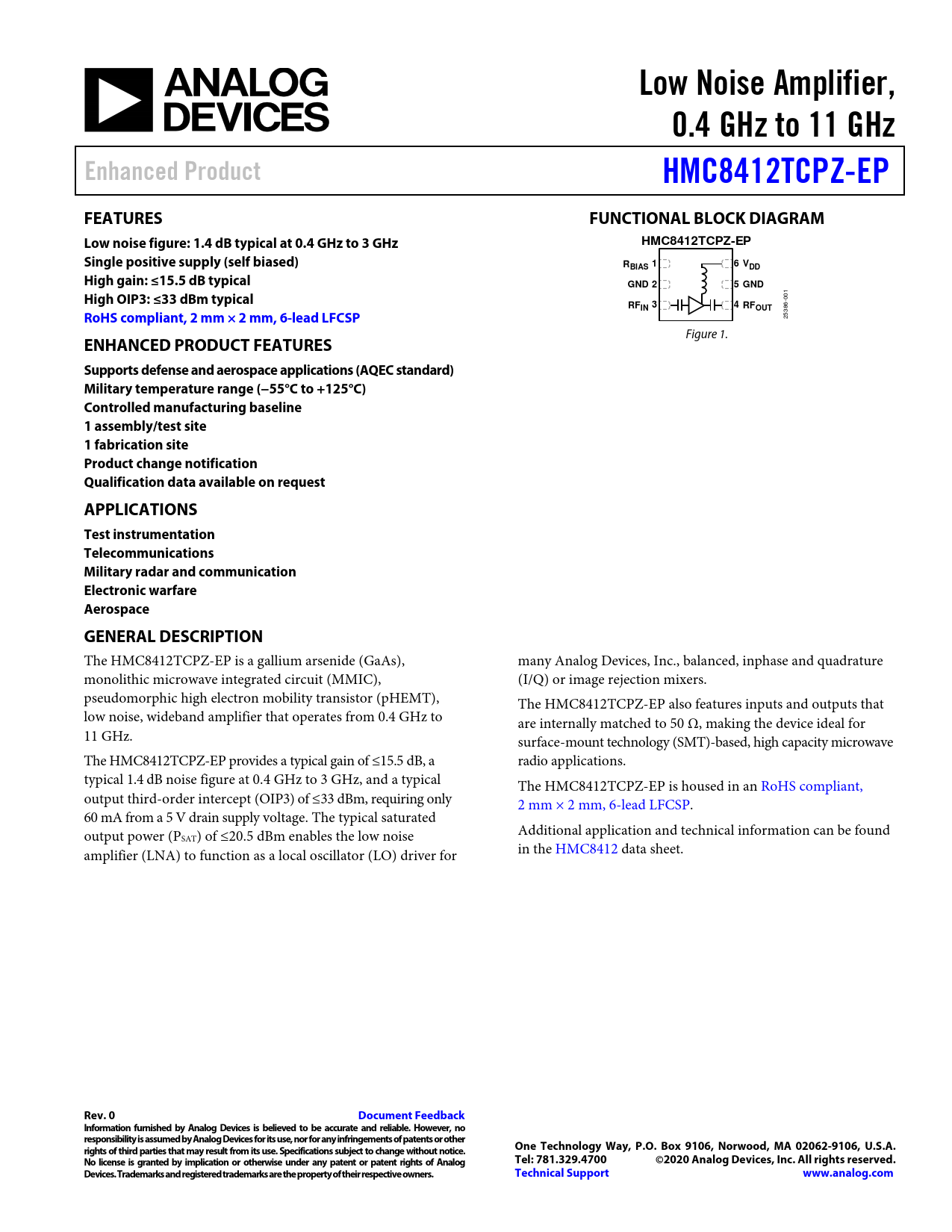 Low Noise Amplifier,. 0.4 GHz to 11 GHz. Enhanced Product. HMC8412TCPZ-EP. FEATURES. FUNCTIONAL BLOCK DIAGRAM
