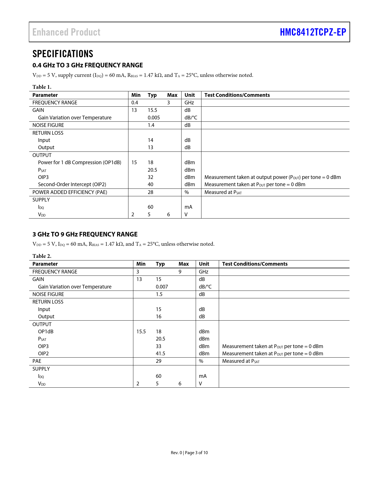 Enhanced ProductHMC8412TCPZ-EPSPECIFICATIONS 0.4 GHz TO 3 GHz FREQUENCY RANGE VDD = 5 V, supply current (IDQ) = 60 mA, RBIAS = 1.47 kΩ, and TA = 25°C, unless otherwise noted. Table 1. ParameterMin TypMax UnitTest Conditions/Comments FREQUENCY RANGE 0.4 3 GHz GAIN 13 15.5 dB Gain Variation over Temperature 0.005 dB/°C NOISE FIGURE 1.4 dB RETURN LOSS Input 14 dB Output 13 dB OUTPUT Power for 1 dB Compression (OP1dB) 15 18 dBm PSAT 20.5 dBm OIP3 32 dBm Measurement taken at output power (POUT) per tone = 0 dBm Second-Order Intercept (OIP2) 40 dBm Measurement taken at POUT per tone = 0 dBm POWER ADDED EFFICIENCY (PAE) 28 % Measured at PSAT SUPPLY IDQ 60 mA VDD 2 5 6 V 3 GHz TO 9 GHz FREQUENCY RANGE VDD = 5 V, IDQ = 60 mA, RBIAS = 1.47 kΩ, and TA = 25°C, unless otherwise noted. Table 2. ParameterMinTypMaxUnitTest Conditions/Comments FREQUENCY RANGE 3 9 GHz GAIN 13 15 dB Gain Variation over Temperature 0.007 dB/°C NOISE FIGURE 1.5 dB RETURN LOSS Input 15 dB Output 16 dB OUTPUT OP1dB 15.5 18 dBm PSAT 20.5 dBm OIP3 33 dBm Measurement taken at POUT per tone = 0 dBm OIP2 41.5 dBm Measurement taken at POUT per tone = 0 dBm PAE 29 % Measured at PSAT SUPPLY IDQ 60 mA VDD 2 5 6 V Rev. 0 | Page 3 of 10 Document Outline Features Enhanced Product Features Applications Functional Block Diagram General Description Revision History Specifications 0.4 GHz to 3 GHz Frequency Range 3 GHz to 9 GHz Frequency Range 9 GHz to 11 GHz Frequency Range Absolute Maximum Ratings Thermal Resistance Electrostatic Discharge (ESD) Ratings ESD Ratings for HMC8412TCPZ-EP Power Derating Curves ESD Caution Pin Configuration and Function Descriptions Interface Schematics Typical Performance Characteristics Outline Dimensions Ordering Guide