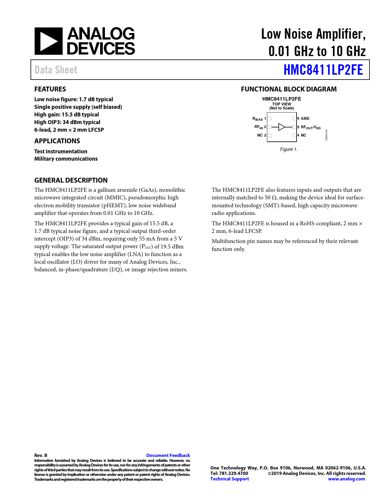 Low Noise Amplifier,. 0.01 GHz to 10 GHz. Data Sheet. HMC8411LP2FE. FEATURES. FUNCTIONAL BLOCK DIAGRAM
