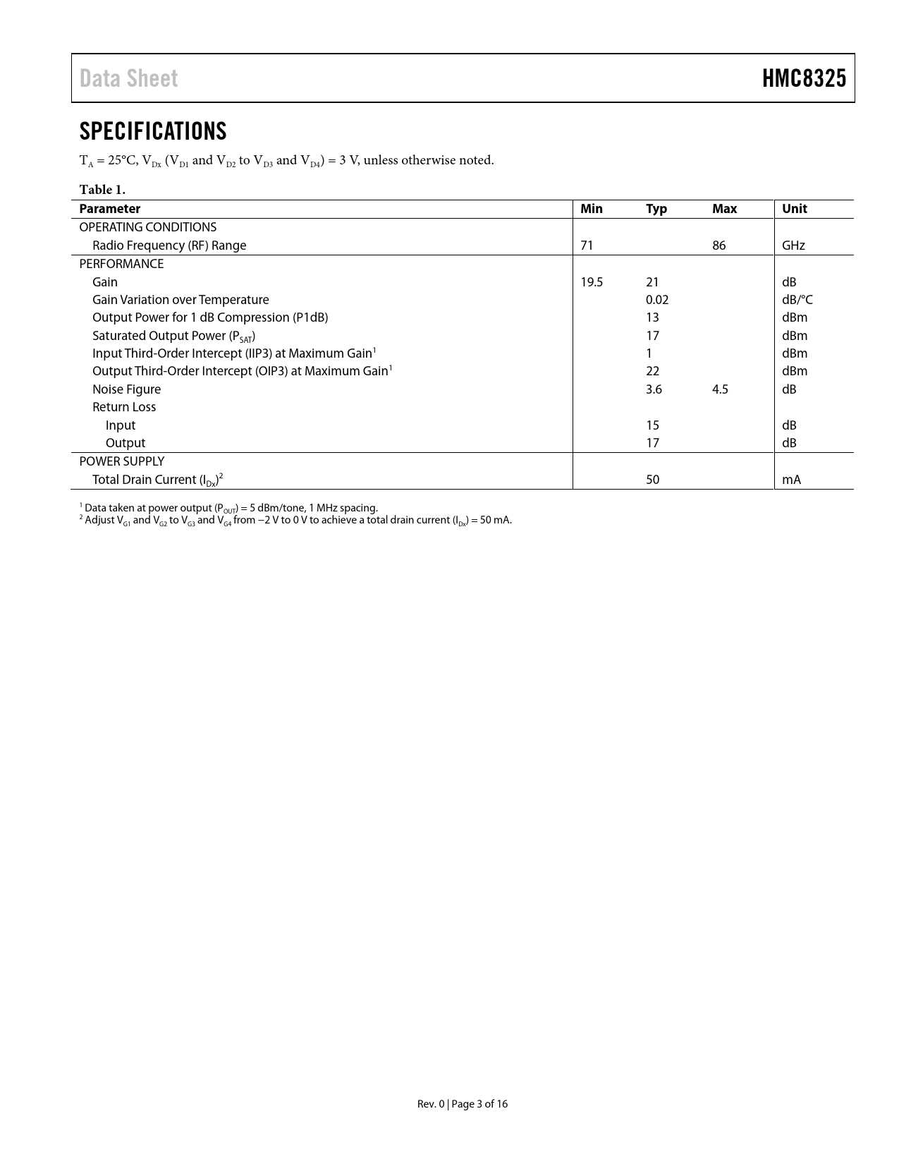 Pages / Page16 / 3 — Data Sheet. HMC8325. SPECIFICATIONS. Table 1. Parameter. Min. Typ. Max. …