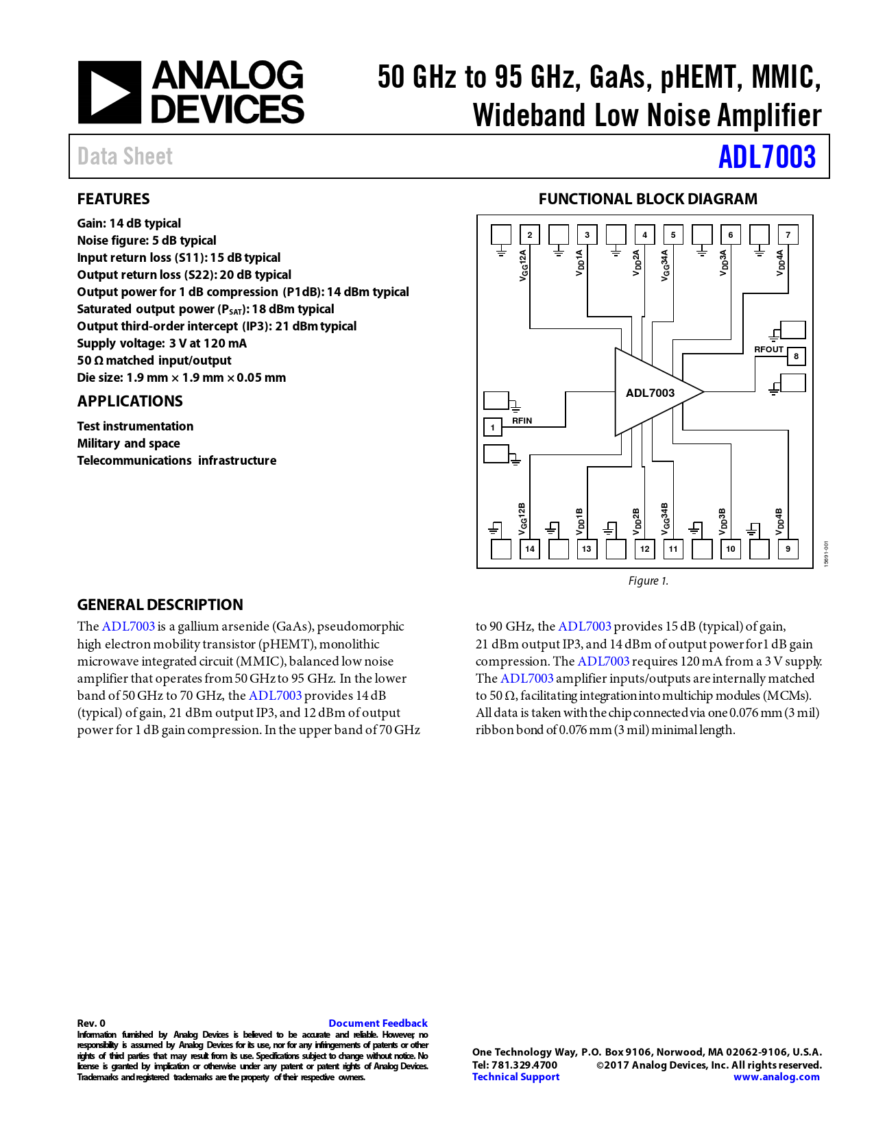50 GHz to 95 GHz, GaAs, pHEMT, MMIC,. Wideband Low Noise Amplifier. Data Sheet. ADL7003. FEATURES. FUNCTIONAL BLOCK DIAGRAM