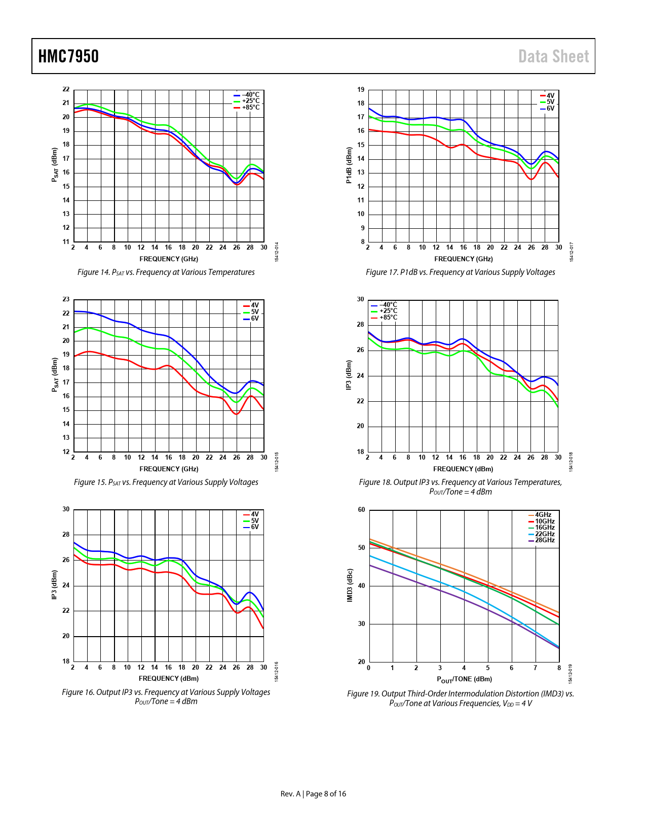 HMC7950 Data Sheet 22 19 –40°C 4V 21 +25°C 5V +85°C 18 6V 20 17 19 16 18 15 17 14 dBm) (dBm) 16 B ( 13 P SAT P1d 15 12 14 11 13 10 12 9 11 8 2 4 6 8 10 12 14 16 18 20 22 24 26 28 30