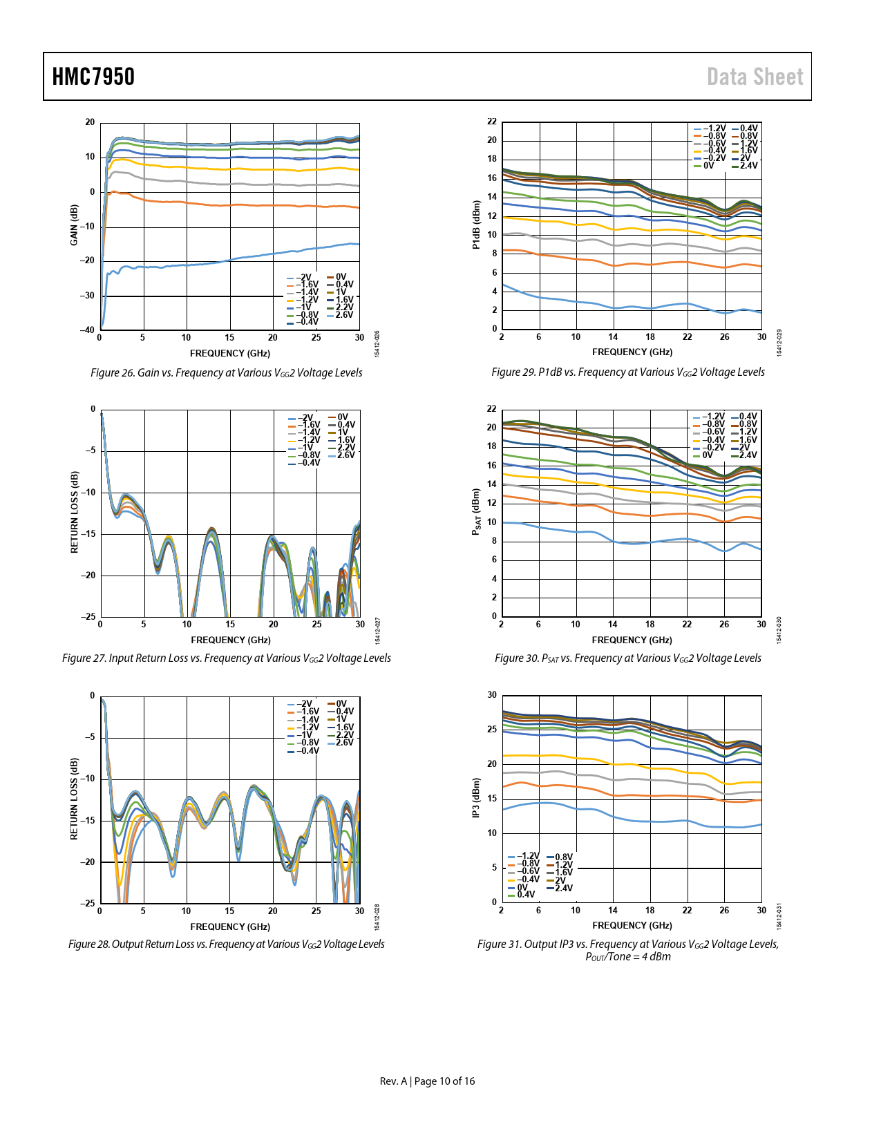 HMC7950Data Sheet2022–1.2V0.4V20–0.8V0.8V–0.6V1.2V–0.4V1.6V1018–0.2V2V0V2.4V16014dB)12dBm)N ( –10AIB ( 10GP1d8–20–2V0V6–1.6V0.4V–30–1.4V1V4–1.2V1.6V–1V2.2V–0.8V2.6V2–0.4V–400051015202530 026 26101418222630 029 FREQUENCY (GHz) 15412- FREQUENCY (GHz) 15412- Figure 26. Gain vs. Frequency at Various VGG2 Voltage Levels Figure 29. P1dB vs. Frequency at Various VGG2 Voltage Levels 022–2V0V–1.2V0.4V–1.6V0.4V–0.8V0.8V–1.4V1V20–0.6V1.2V–1.2V1.6V–0.4V1.6V–5–1V2.2V18–0.2V2V–0.8V2.6V0V2.4V–0.4V1614–10SS (dB) O12(dBm) AT 10–15TURN LP S 8RE6–2042–250051015202530 027 26101418222630 030 FREQUENCY (GHz) 15412- FREQUENCY (GHz) 15412- Figure 27. Input Return Loss vs. Frequency at Various VGG2 Voltage Levels Figure 30. PSAT vs. Frequency at Various VGG2 Voltage Levels 030–2V0V–1.6V0.4V–1.4V1V–1.2V1.6V25–5–1V2.2V–0.8V2.6V–0.4V20–10SS (dB) OdBm) 15–15IP3 (TURN L RE10–1.2V–200.8V5–0.8V1.2V–0.6V1.6V–0.4V2V0V2.4V0.4V–250051015202530 028 26101418222630 031 FREQUENCY (GHz) 15412- FREQUENCY (GHz) 15412- Figure 28. Output Return Loss vs. Frequency at Various VGG2 Voltage Levels Figure 31. Output IP3 vs. Frequency at Various VGG2 Voltage Levels, POUT/Tone = 4 dBm Rev. A | Page 10 of 16 Document Outline FEATURES APPLICATIONS FUNCTIONAL BLOCK DIAGRAM GENERAL DESCRIPTION REVISION HISTORY SPECIFICATIONS 2 GHz TO 5 GHz FREQUENCY RANGE 5 GHz TO 18 GHz FREQUENCY RANGE 18 GHz TO 28 GHz FREQUENCY RANGE DC SPECIFICATIONS ABSOLUTE MAXIMUM RATINGS THERMAL RESISTANCE ESD CAUTION PIN CONFIGURATION AND FUNCTION DESCRIPTIONS INTERFACE SCHEMATICS TYPICAL PERFORMANCE CHARACTERISTICS THEORY OF OPERATION APPLICATIONS INFORMATION EVALUATION BOARD EVALUATION BOARD SCHEMATIC OUTLINE DIMENSIONS ORDERING GUIDE