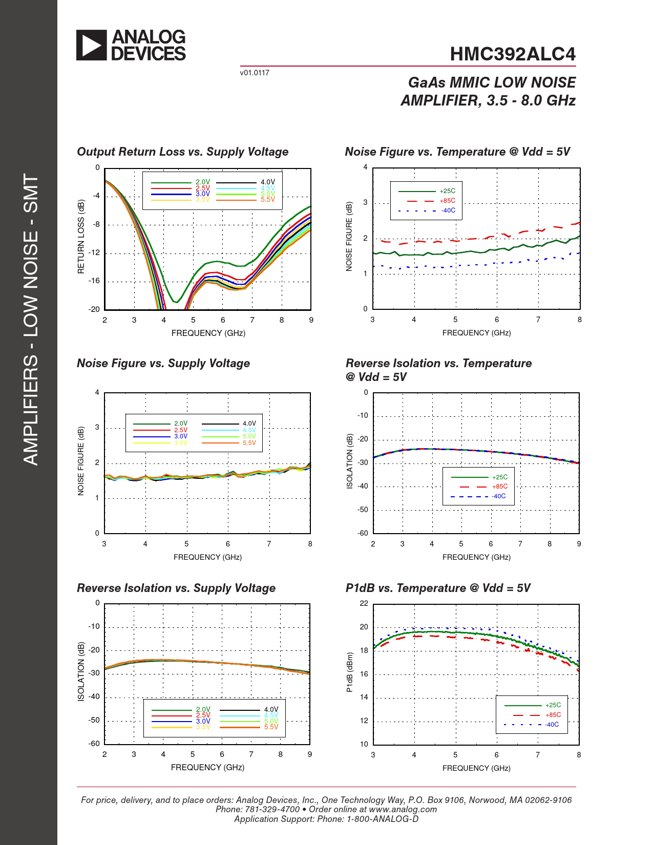 0 22 -10 20 ) B -20 d 18 ) ( m N IO -30 (dB 16 T A L 1dB P O -40 14 IS +25C 2.0V 4.0V 2.5V 4.5V +85C -50 3.0V 5.0V 12 -40C 3.5V 5.5V -60 10 2 3 4 5 6 7 8 9 3 4 5 6 7 8 FREQUENCY (GHz) FREQUENCY (GHz) For price, delivery, and to place orders: Analog Devices, Inc., One Technology Way, P.O. Box 9106, Norwood, MA 02062-9106 Phone: 781-329-4700 • Order online at www.analog.com Application Support: Phone: 1-800-ANALOG-D